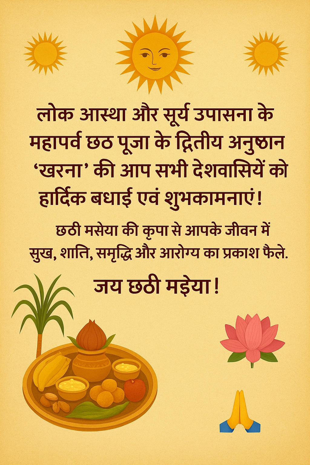 लोक आस्था और सूर्य उपासना के महापर्व छठ पूजा के द्वितीय अनुष्ठान खरना की हार्दिक शुभकामनाएं। यह पर्व आपके जीवन में सुख, समृद्धि और ऊर्जावान नई शुरुआत लाए। सूर्य देव सभी पर अपनी कृपा और प्रकाश बरसाएं। 🙏🌅