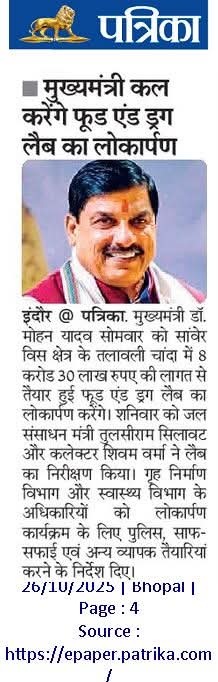 मुख्यमंत्री डॉ. मोहन यादव 27 अक्टूबर को तलावली चांदा में करेंगे फूड एंड ड्रग लैब का लोकार्पण