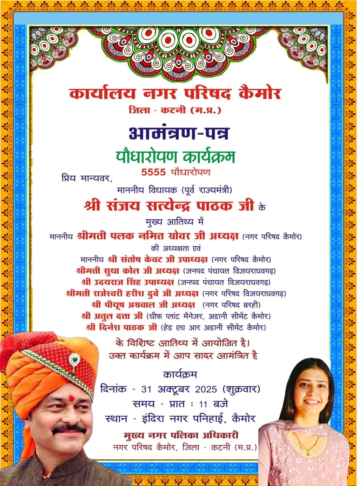 विजयराघवगढ़ क्षेत्र के लोकप्रिय जननायक एवं जन-जन की धड़कन विधायक संजय सत्येंद्र पाठक के 55वें जन्मदिवस पर इस वर्ष आयोजन ऐतिहासिक स्वरूप में मनाया जाएगा। उद्योगपति एवं कैमोर नगर परिषद अध्यक्ष श्रीमती पलक नमित ग्रोवर ने बताया कि जन्मदिवस को समाजसेवा और पर्यावरण संरक्षण के संगम के रूप में मनाने की रूपरेखा तैयार की गई है।उन्होंने बताया कि विधायक संजय सत्येंद्र पाठक के प्रति जनसमर्थन और स्नेह इस बात से झलकता है कि उनका जन्मदिन प्रत्येक वर्ष दीपावली की तरह हर्षोल्लास के साथ मनाया जाता है। इसी परंपरा को आगे बढ़ाते हुए इस वर्ष संजू भैया के 55वें जन्मोत्सव पर विशेष कार्यक्रमों की श्रृंखला आयोजित की जाएगी।कार्यक्रम के अंतर्गत 5555 पौधों का वृक्षारोपण पनिहाई क्षेत्र में किया जाएगा जिससे पर्यावरण संरक्षण का संदेश दिया जाएगा। साथ ही गरीबों को कम्बल वितरण कर सेवा भावना का परिचय दिया जाएगा।सांस्कृतिक कार्यक्रमों में मधुर संगीत के माध्यम से संगीतकार मनीष अग्रवाल विशेष रूप से जन्मदिवस गीत प्रस्तुत करेंगे नगर का वातावरण उल्लासमय बना रहेगा। इसके अतिरिक्त विद्यार्थियों के लिए खेल कूद प्रतियोगिताएँ आयोजित की जाएंगी जिससे नवपीढ़ी में उत्साह और ऊर्जा का संचार होगा।यह भव्य समारोह कैमोर पनिहाई मंदिर प्रांगण में आयोजित होगा, जिसकी शुरुआत प्रातः 10 बजे से होगी।