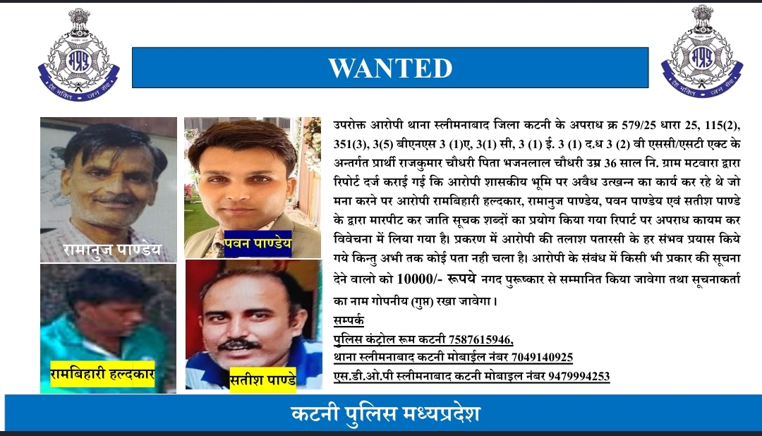 जिला कटनी अंतर्गत थाना स्लीमनाबाद मे दर्ज अपराध क्र 579/25 धारा 25, 115 (2), 351(3), 3(5) बीएनएस 3 (1) ए, 3 (1) सी, 3 (1) ई, 3 (1) द,ध 3 (2) वी एससी/एसटी एक्ट में आरोपी 1. राम बिहारी हल्दकार पिता कठोरी लाल हल्दकार उम्र 45 वर्ष, 02. रामानुज पाण्डेय पित्ता स्व. रामकिशोर पाण्डेय उम्र 60 वर्ष 04 माह, 03. सतीष पाण्डेय पिता नारायण पाण्डेय उम्र 34 वर्ष 03 माह, 04. पवन पाण्डेय पिता शंभुज पाण्डेय उम्र 31 वर्ष सभी निवासी मटवारा थाना स्लीमनाबाद जिला कटनी घटना कारित करने के पश्चात से फरार हैं, उक्त फरार आरोपीयों की हरसंभव पत्तासाजी करने के पश्चात भी प्रकरण के आरोपीगणों का कोई पता नही चला हैं।