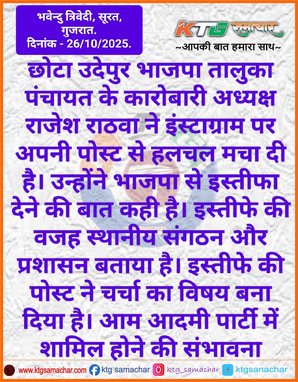 छोटा उदयपुर भाजपा तालुका पंचायत के कारोबारी अध्यक्ष राजेश राठवा ने इंस्टाग्राम पर अपनी पोस्ट से हलचल मचा दी है।
