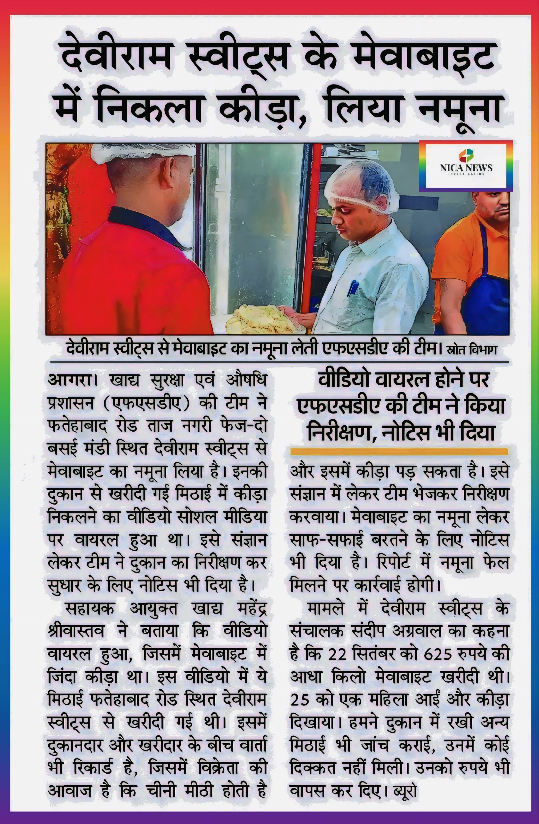 आगरा के फतेहाबाद रोड स्थित प्रतिष्ठित देवीराम मिष्ठान भंडार की मिठाई में कीड़े निकलने का दावा किया गया है.