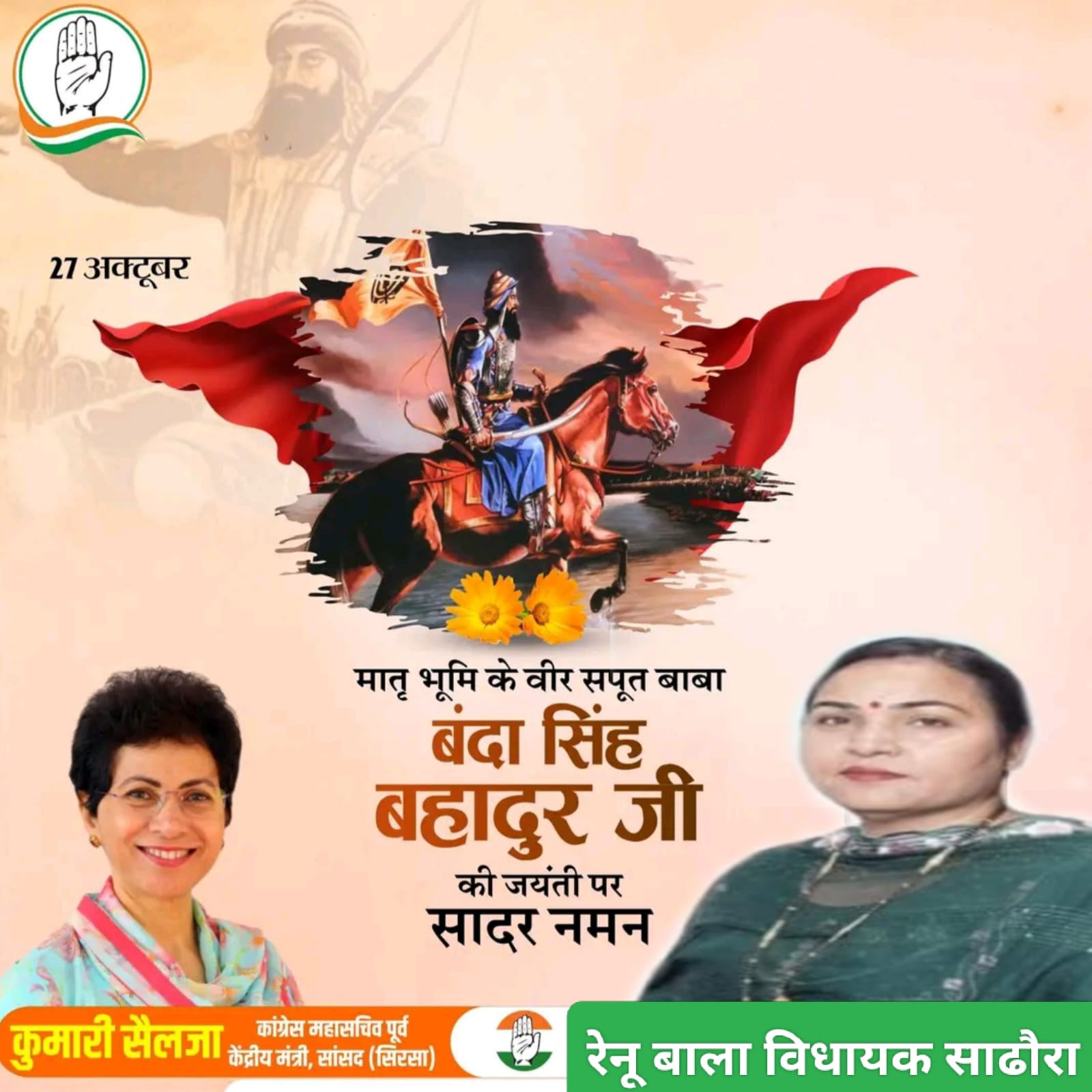 कपुरी :- हल्का सधौरा विधायक मैडम रेणु बाला जी नें बादशाह बाबा बंदा सिंघ बहादुर "शहीद" पहले स्वतंत्रता सेनानी जी की जयंती पर इस प्रकार उदगार पेश किये, "शौर्य, त्याग और न्याय के प्रतीक बाबा बंदा सिंह बहादुर जी की जयंती पर शत-शत नमन। उन्होंने अन्याय और अत्याचार के विरुद्ध डटकर संघर्ष किया और समाज में समानता व न्याय की स्थापना की, उनका बलिदान हमेशा हमें साहस और धर्म के मार्ग पर चलने की प्रेरणा देता रहेगा"!