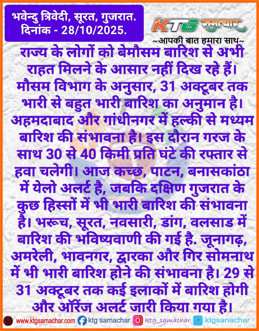 मौसम विभाग के अनुसार 31 अक्टूबर तक भारी से बहुत भारी बारिश का अनुमान है।