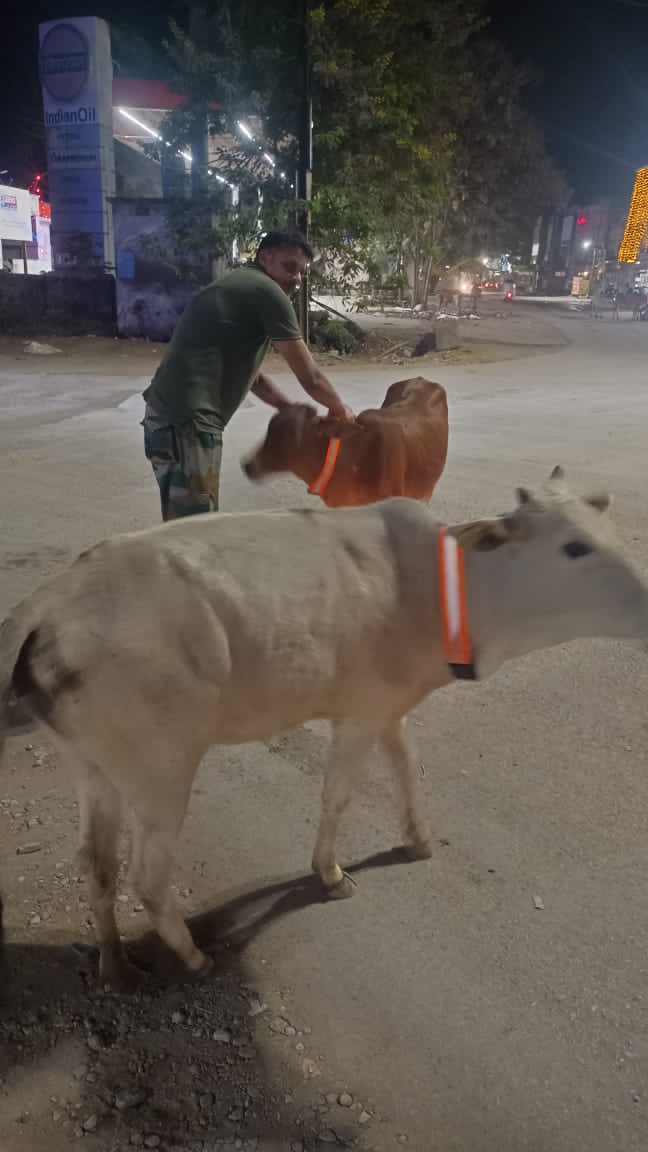 सड़कों पर घूमने और बैठने वाले पशुओं को गले में पहनाया गया रिफलेक्टर बेल्ट।*