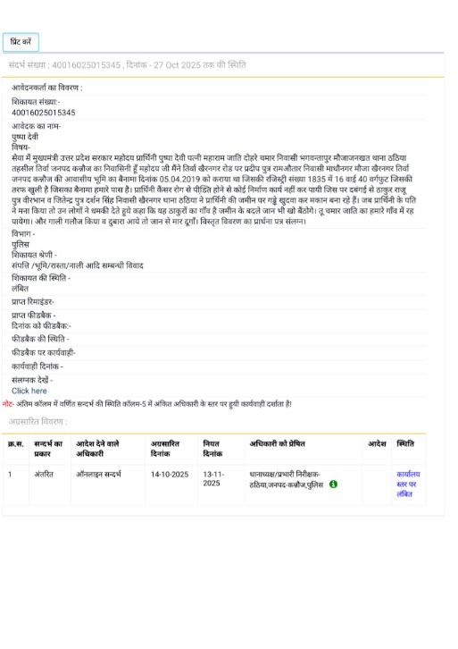 जिला कन्नौज थाना ठठिया गांव भगवन्तपुर मौजा जनखत तहसील तिर्वा पुष्पा देवी पत्नी महाराम दोहरे ने गांव खैरनगर प्लांट 16*40 वर्ग फुट है जो कि प्लांट पर कब्जा ठाकुर समाज एक व्यक्ति कर लिया है पीड़ित ने पत्नी कैंसर रोग पीड़ित हैं इलाज़ चल रहा है जन सुनवाई पोर्टल प्रार्थना पत्र दिया है थाना प्रभारी प्रार्थना पत्र, समाज कल्याण राज्य मंत्री श्री असीम अरुण जी प्रार्थना पत्र, तिर्वा एसडीएम को प्रार्थना पत्र कोई सुनवाई नहीं हुई है