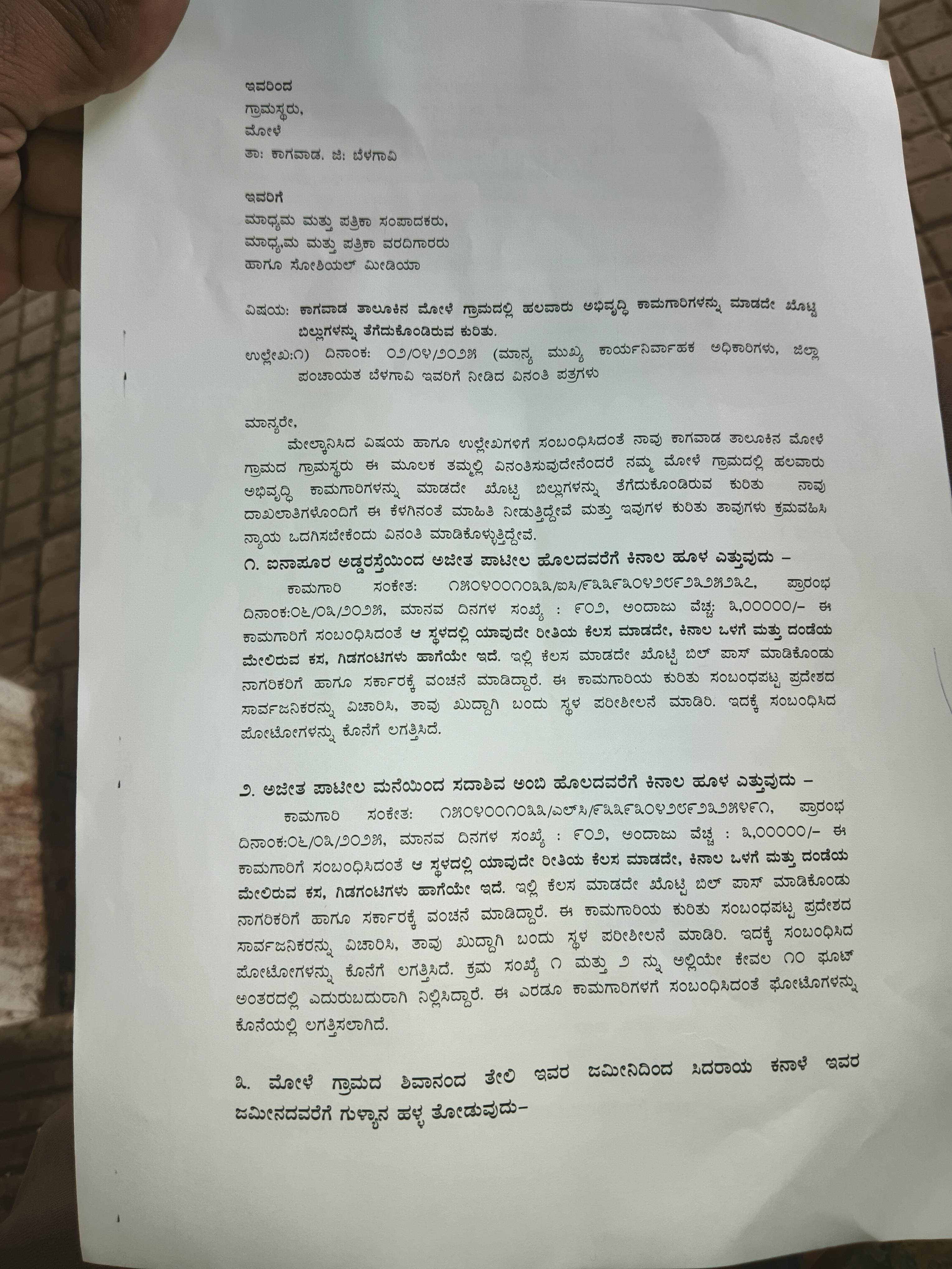 ಬೆಳಗಾವಿ ಜಿಲ್ಲೆ ಕಾಗವಾಡ ತಾಲೂಕಿನಲ್ಲಿ ಮೋಳೆ ಗ್ರಾಮ ಪಂಚಾಯತಿಯಲ್ಲಿ ಸಾಕಷ್ಟು ಅವ್ಯವಹಾರ ನಡೆದಿದ್ದು ಸೂಕ್ತ ತನಿಖೆ ನಡೆಸಿ ಮಾಧ್ಯಮ ಹಾಗೂ ಪತ್ರಿಕಾ ಮುಖಾಂತರ ಸರಕಾರಕ್ಕೆ ಮನವಿ ಮಾಡಿಕೊಳ್ಳುತ್ತಿದ್ದಾರೆ