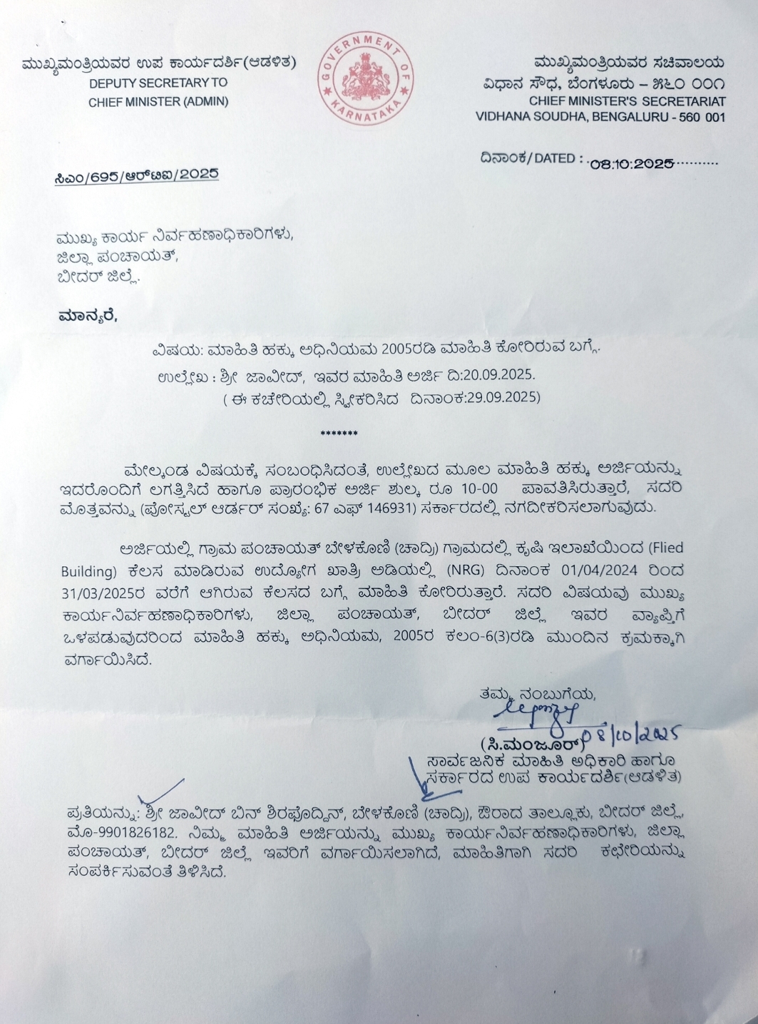 ಸರ್ ನಾನು ಜಾವೀದ್ ಶಾರ್ಫುದ್ದಿನ್ ನನ್ನ ತಂದೆ ಹೆಸರು ಸಾರ್ವೇ ನೋಬರ್ 55ಇದೆ. ಇದರ ಪಕ್ಕ ದಲಿ ಮಾತೋಬಾರ್ ಹೆಸರಲಿ ಸುಳ್ಳು ಕೆಲಸ ನರೇಗಾ ಅಡಿ ಯಲ್ಲಿ ಮಾಡಿ ದಾರೆ.. ಕೃಷಿ ಇಲಾಖೆ ಅಧಿಕಾರಿಗಳು ಕೇಳಿದರೆ ಸಹಕಾರ ನೀಡದ ಕಾರಣ ನಾನು ಕರ್ನಾಟಕ ಮುಖ್ಯಮಂತ್ರಿ ಆರಿಗೆ (RTI)ಅರ್ಜಿ ಹಾಕಿದೆ ಉತ್ತರ ನು ಬಂದಿದೆ ಆದೆರೆ ಈಲೀಯಾ ಕೃಷಿ ಇಲಾಖೆ ಅಧಿಕಾರಿಗಳು ಸಹಕಾರ ನೀಡಿತಾಲಿಯಾ... ರೈತರ ರೀ ಗ್ ರ ಬಿಡ್ರಿ ಸರ್.. ಆರ್ದ ಕೆಲಸ ಮಾಡಿ ಬಿಲ್ ಮಾಡ್ಕೊಡಿತು ನಮ್ಮ ಹೊಲ ನೋಡಿ ಬಂದು (ಡೂಪ್ಲಿಕೇಟ್ ಬಂಡಿಂಗ್ )ಕೆಲಸ...