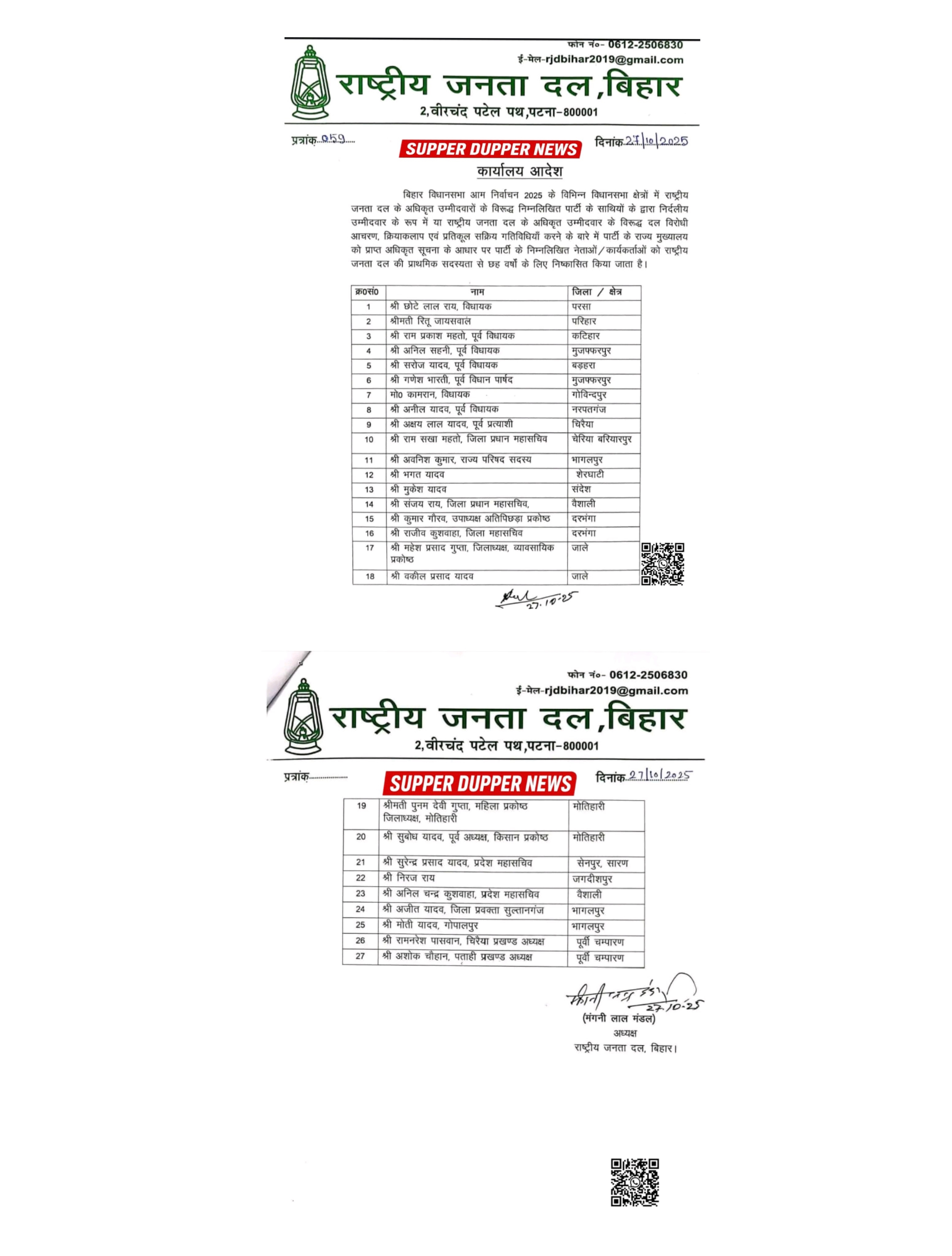 *रितु जायसवाल व अच्छेलाल यादव समेत राजद ने अपने पार्टी से 27 को 6 साल के लिए बाहर निकाला*
