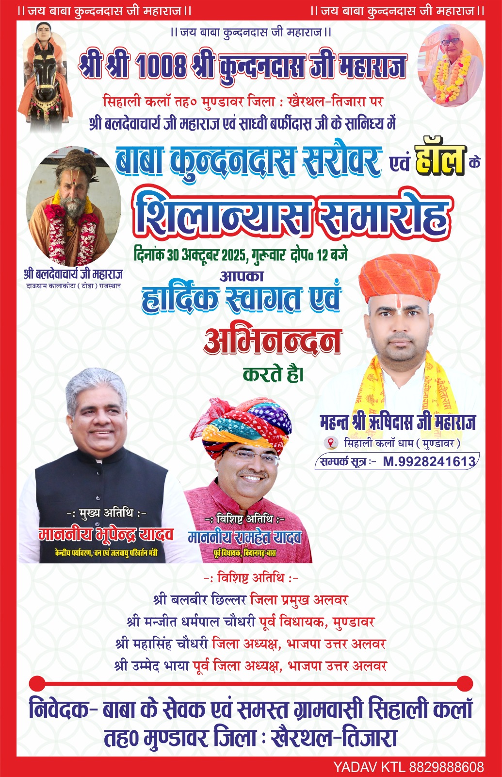 मुण्डावर (अलवर)। ग्राम सिहाली कलां तहसील मुण्डावर, जिला खैरथल-तिजारा में बाबा कुन्दनदास सरोवर एवं हॉल के शिलान्यास समारोह का आयोजन 30 अक्टूबर 2025, गुरुवार को दोपहर 12 बजे किया जाएगा।
