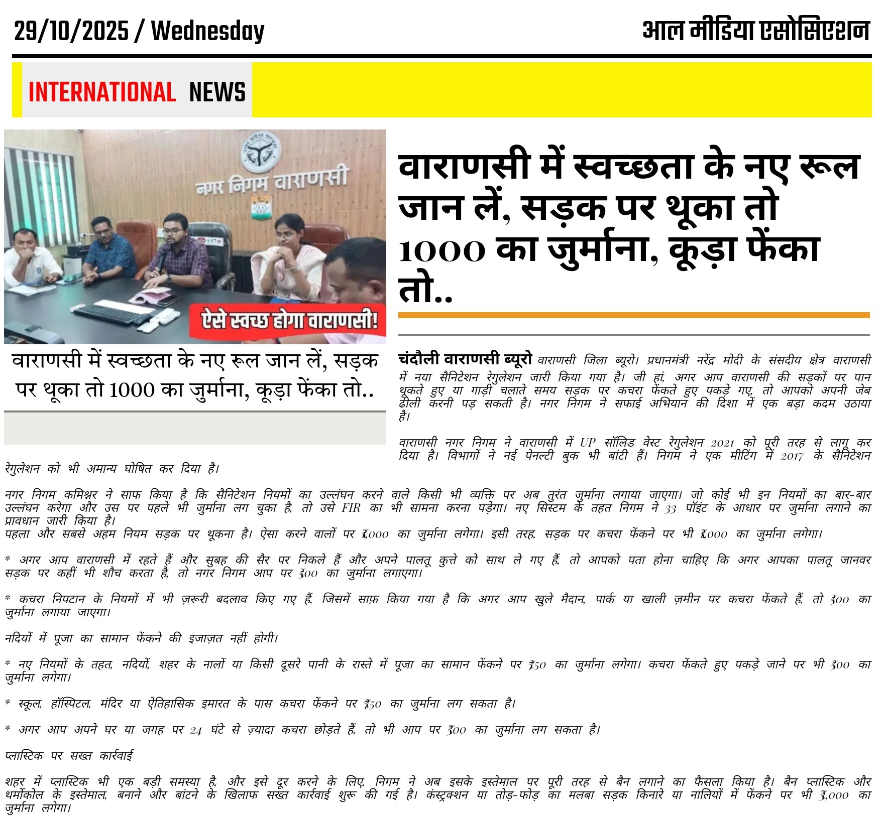 वाराणसी में स्वच्छता के नए रूल जान लें, सड़क पर थूका तो 1000 का जुर्माना, कूड़ा फेंका तो..