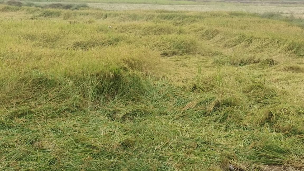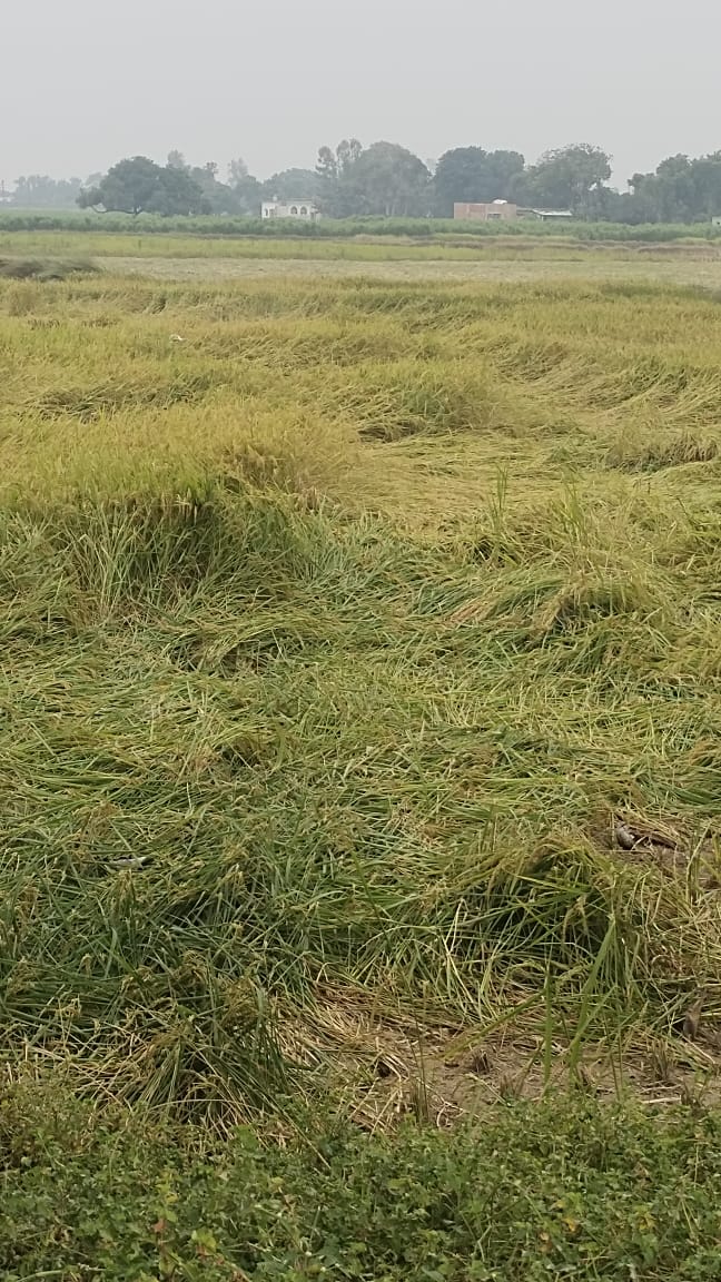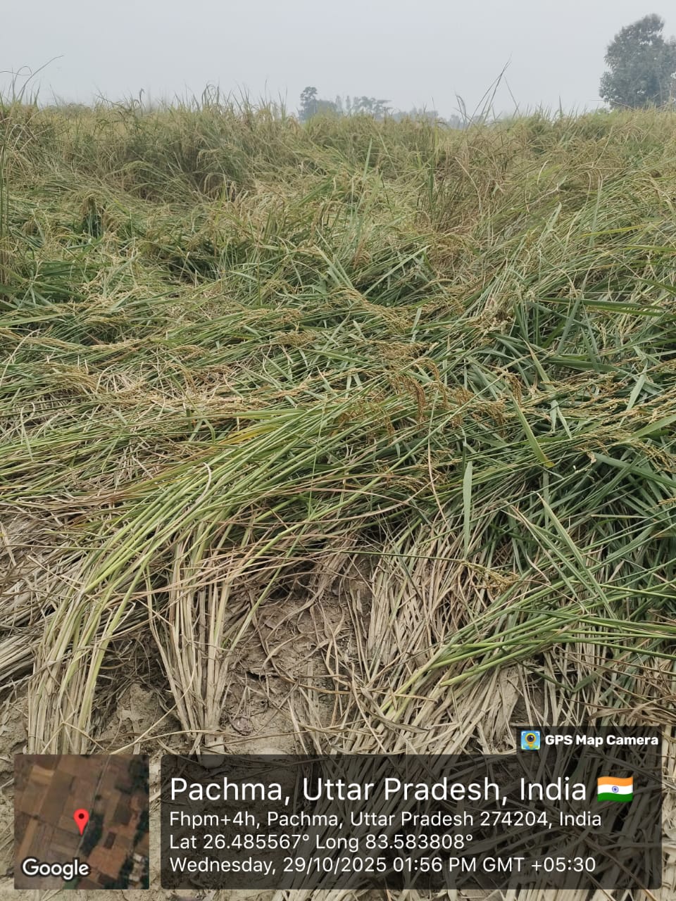 देवरिया जिले के रुद्रपुर ब्लॉक की पंचायत पचमा के गाँव सतुआभार में मौसम की बेरुखी ने किसानों की उम्मीदों पर गहरी चोट की है। गाँव के किसान दूधनाथ विश्वकर्मा की मेहनत से तैयार धान की फसल हाल ही में हुई अधेरी बरसात और तेज तूफान की वजह से पूरी तरह से जमीन पर गिर गई है।