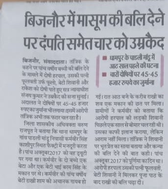 जिसमें ग्राम सिपाहियों वाला टांडा ग्राम के एक भ्रष्ट तांत्रिक क्रिया करने वाला रामकुमार जो अब तक लापता है उस राक्षस प्रवृत्ति के जाल में फंसकर एक छोटी सी देवी समान करमवीर सिंह सैनी की बेटी को हरपाल सिंह सैनी पुत्र टीके सिंह सैनी, हरपाल सिंह सैनी की पत्नी फूलवती, पुत्री शिवानी व सहायक राकेश सिंह सैनी पुत्र चंद्रपाल सिंह सैनी निवासी उपरोक्त द्वारा उस मासूम छोटी सी देवी बालिका को बहला फुसलाकर अपने किसी गुप्त स्थान पर पापी तांत्रिक रामकुमार निवासी सिपाहियों वाला टांडा के कहने से बालिका के हाथ, पैर को छिन्न भिन्न कर उसके शरीर से कुछ अंग व रक्त (खून) को निकालकर अपनी क्रिया पापी क्रिया को तांत्रिक रामकुमार की मदद से अंजाम देकर उस मासूम छोटी बच्ची के अंगों को जहां तहां छुपा दिया ताकि किसी को कोई सबूत न मिल सके लेकिन कहा गया है कि सत्य छिपता नहीं प्रशासन की सहायता से आखिर ये घटनाक्रम सबके समक्ष आ ही गया और दिनांक 30 अक्टूबर 2025 को जिला सत्र न्यायाधीश बिजनौर द्वारा आखिर इस प्रकार का दुष्कर्म करने वाले गिरोह केवल तांत्रिक रामकुमार जो फरार है बाकि सभी चारों को धारा 302,201,120 के अंतर्गत तुरन्त उम्रकैद की सजा सुनाई गई ताकि भविष्य में कोई भी व्यक्ति इस प्रकार का कृत्य न कर सके। करमवीर सिंह सैनी पुत्र घनश्याम सिंह सैनी के परिवार के सभी सदस्यों ने प्रशासन, न्यायाधीश जी की भरपूर सराहना की है।