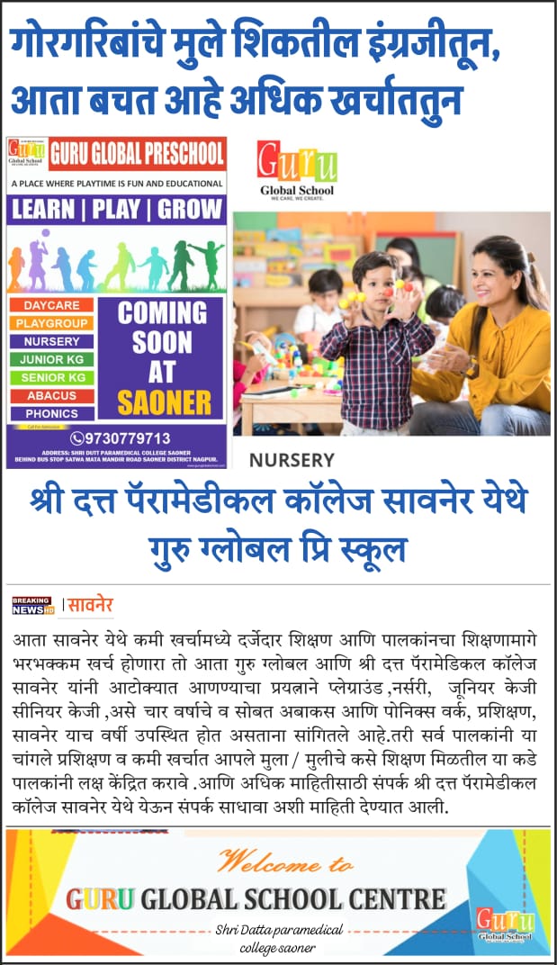 गुरु ग्लोबल प्रि स्कूल स्कूल श्री दत्त पॅरामेडीकल कॉलेज सावनेर यहा सुरू सावनेर