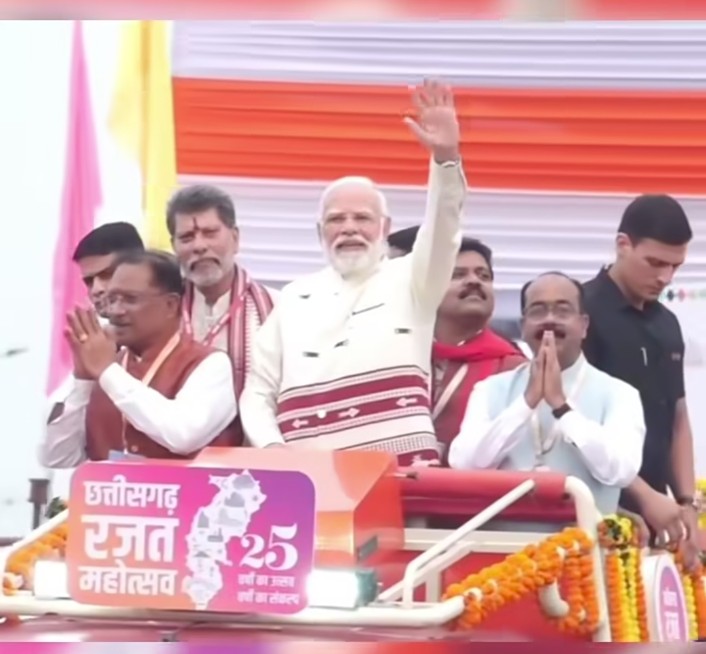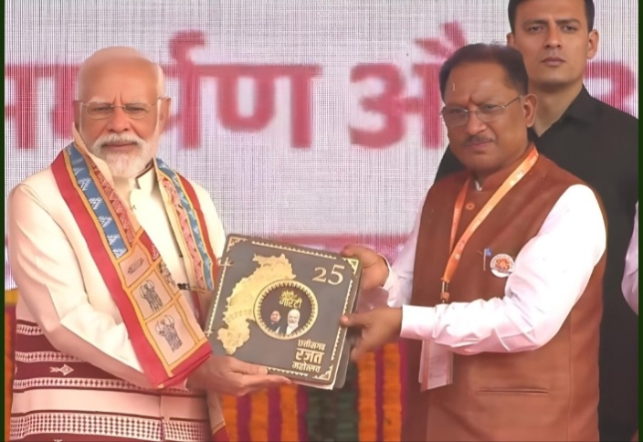 छत्तीसगढ़ 25 वी राज्य उत्सव पर पधारे महामहिम यशस्वी प्रधानमंत्री श्री नरेंद्र मोदी जी ने शुभ अवसर पर मां छत्तीसगढ़ीन महतारी का गुणगान करते हुए अपने सभी कार्यक्रमों पर हिस्सा लिया। राज्य समारोह पर विशिष्ट मुख्य अतिथि राज्यपाल श्री रमेन डेका जी, मुख्यमंत्री श्री विष्णु देव साय जी, उपमुख्यमंत्री श्री अरुण साव जी एवं कई वरिष्ठ अधिकारी समारोह पर शामिल हुए। राज्योत्सव समारोह पर छत्तीसगढ़ की सभी अतिथियों और दूर दराज राज्यों से पधारे हमारे भारतीय अतिथि भी समारोह पर शामिल होकर पांच दिनों तक चलने वाले राज्योत्सव का उद्घाटन किया।