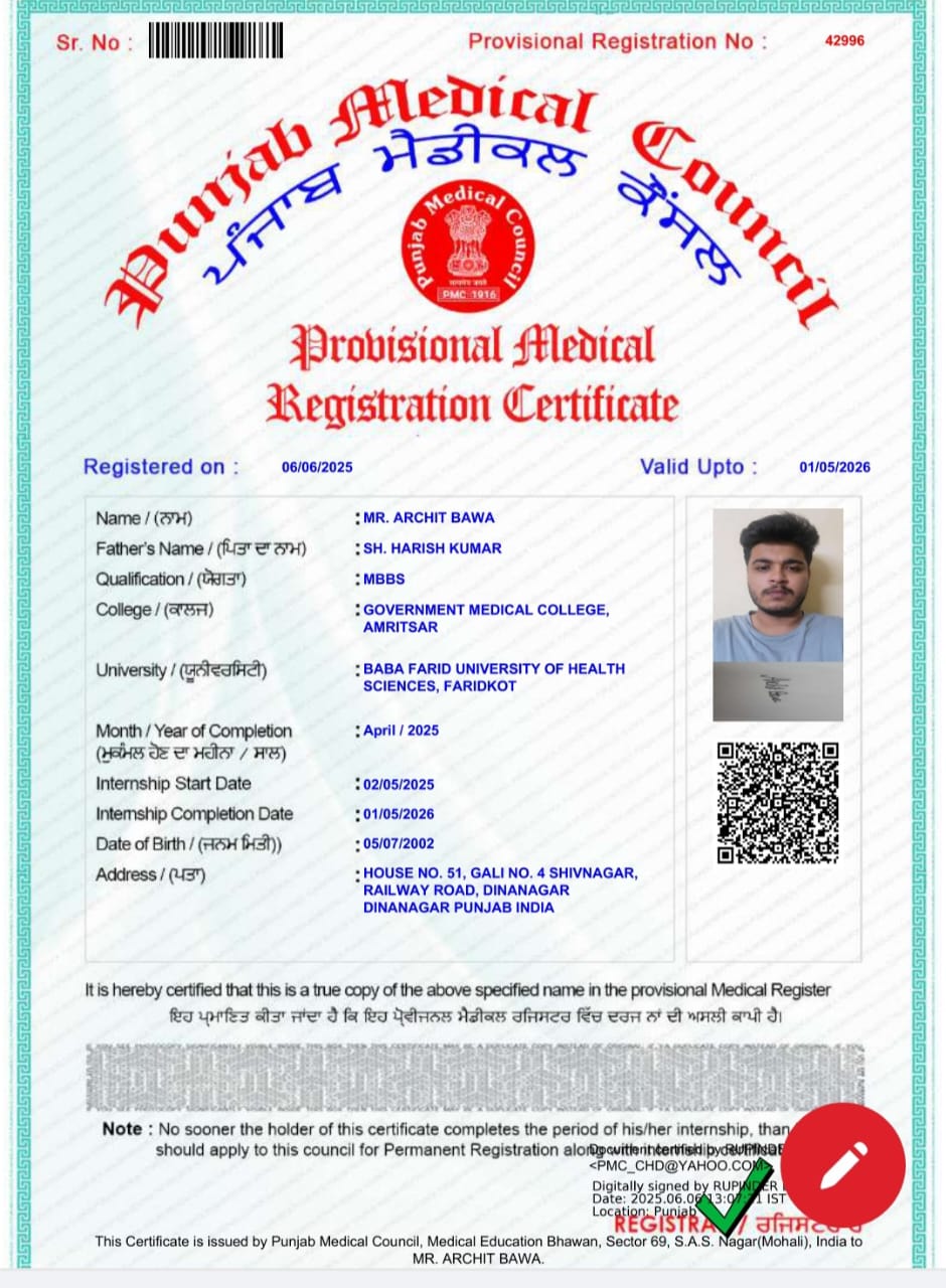 रामनगर (नरेश कुमार स्वामी निंबार्क ) मेरे प्रिय दोस्त के बेटे डॉक्टर बने अर्चित बावा पुत्र हरीश कुमार बावा शिव नगर दीनानगर पंजाब ने एमबीबीएस की परीक्षा पास करके वैष्णव बैरागी समाज का और अपने परिवार का मान बढ़ाया |