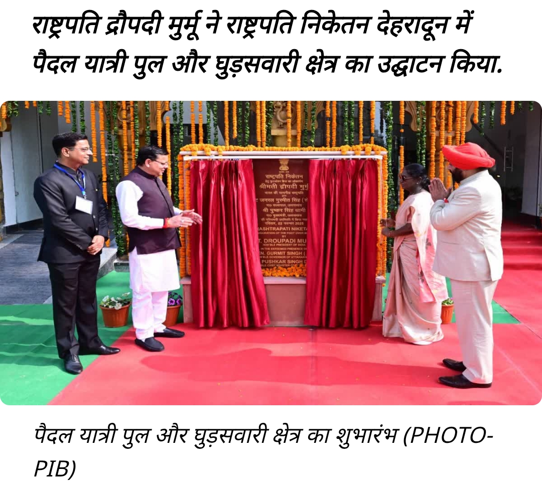 देहरादून पहुंचीं राष्ट्रपति द्रौपदी मुर्मू, किया पैदल यात्री पुल और घुड़सवारी क्षेत्र का शुभारंभ — अब आम जनता भी कर सकेगी अवलोकन