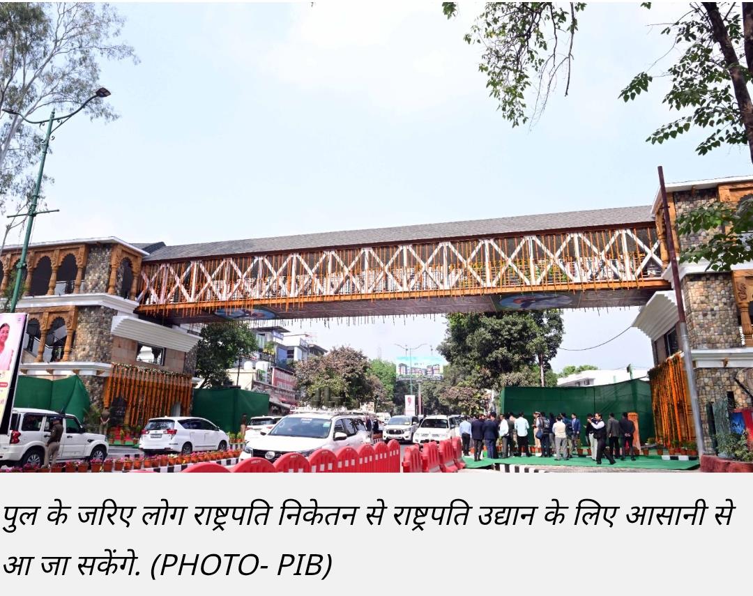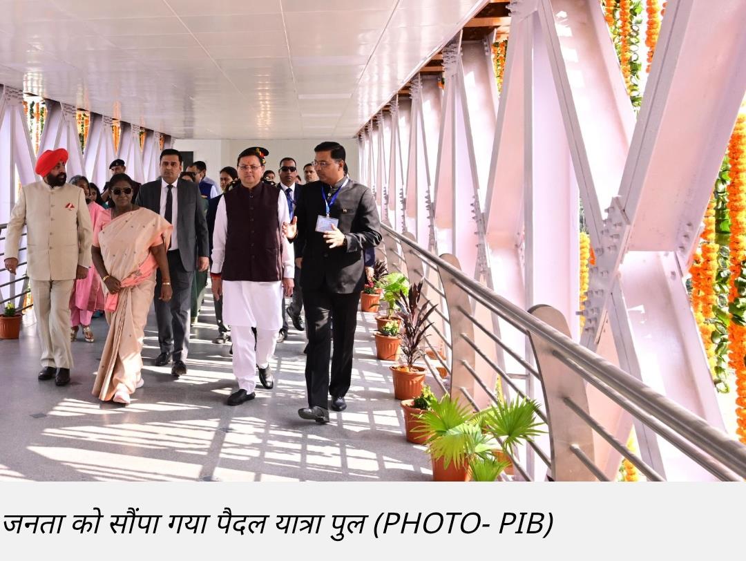 दोपहर करीब 1:20 बजे, राष्ट्रपति मुर्मू ने राजपुर रोड स्थित राष्ट्रपति निकेतन के बाहर बने नए पैदल यात्री पुल का उद्घाटन किया। यह 105 फीट लंबा फुट ओवर ब्रिज, स्थानीय हिमालयी वास्तुकला और सौंदर्य पर आधारित है। पुल का निर्माण उत्तराखंड लोक निर्माण विभाग (PWD) ने मात्र छह महीनों में 9 करोड़ रुपये की लागत से पूरा किया। यह पुल राष्ट्रपति निकेतन को राष्ट्रपति उद्यान से जोड़ता है, जिससे आम नागरिकों और आगंतुकों के लिए आवागमन और सुरक्षा दोनों सुगम हो सकेगी।