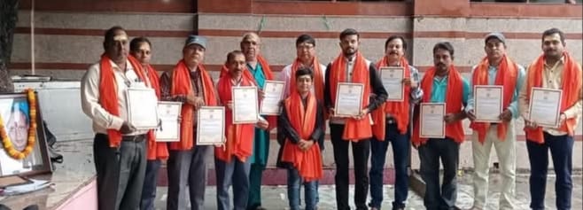 वाराणसी। एस पी श्रीवास्तव वेलफेयर ट्रस्ट एवं इंडिया न्यूज़ बुलेटिन के प्रथम स्थापना दिवस के अवसर काशी के वरिष्ठ पत्रकारों को सम्मानित किया गया। कार्यक्रम का शुभारंभ श्री शूलटंकेश्वर महादेव मंदिर प्रांगण में भगवान महादेव का पूजन अर्चन पंडित राजेंद्र गिरी द्वारा संपन्न करने के बाद स्वर्गीय एसपी श्रीवास्तव के चित्र पर माल्यार्पण से हुआ। कार्यक्रम मे संस्था के देवेन्द्र श्रीवास्तव देवा द्वारा शहर के वरिष्ठ पत्रकार डॉक्टर कैलाश सिंह विकास, आनंद कुमार सिंह अन्ना, अवधेश सिंह, ऋषिदेव उपाध्याय, मोहम्मद दाऊद, डी डी सिंह, मनीष श्रीवास्तव, विक्रम कुमार, विनय श्रीवास्तव, गणेश चंद्र बेलवाल, आशीर्वाद सिंह, अरविंद राय को अंगवस्त्र एवं सर्टिफिकेट देकर सम्मानित किया गया। इस अवसर पर अनेकों गणमान्य लोग उपस्थित थे।