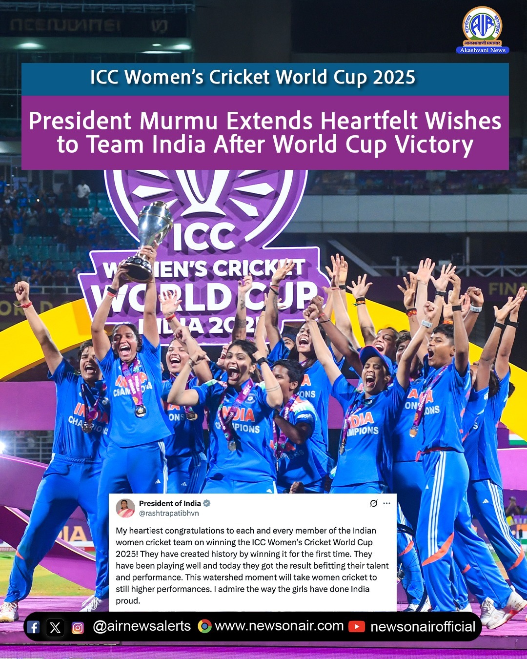 President Murmu Congratulated ICC Women's Cricket World Cup Victory.