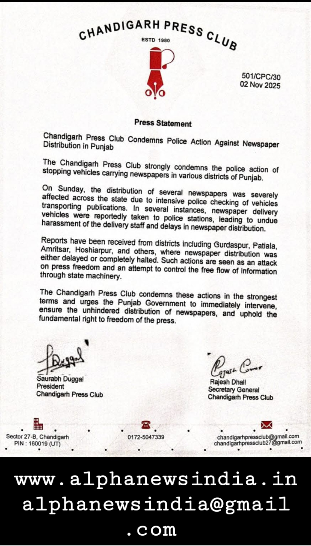 चंडीगढ़ प्रेस क्लब पंजाब के विभिन्न जिलों में समाचार पत्रों से लदे वाहनों को रोकने की पुलिस कार्रवाई की कड़ी निंदा करता है।