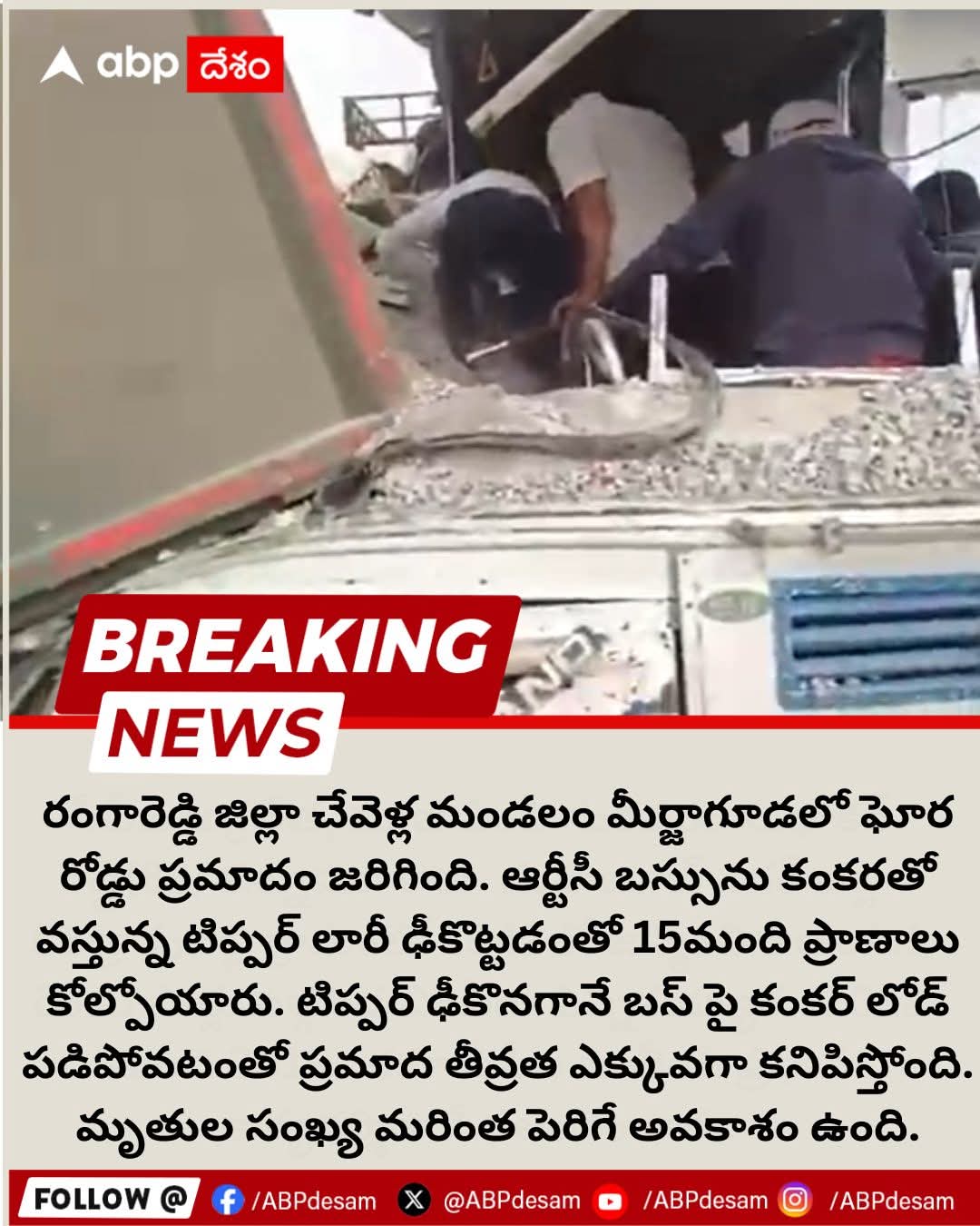 రంగారెడ్డి జిల్లా చేవెళ్ల సమీపంలో ఘోర రోడ్డు ప్రమాదం జరిగింది. ఆర్టీసీ బస్సును కంకరతో వస్తున్న టిప్పర్ లారీ ఢీకొట్టడంతో 15మంది ప్రయాణికులు మృతి చెందారు. మృతుల సంఖ్య మరింత పెరిగే అవకాశం ఉంది