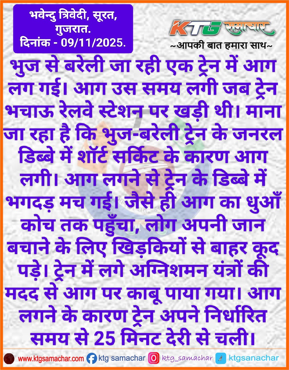 भुज से बरेली जा रही एक ट्रेन में आग लग गई।