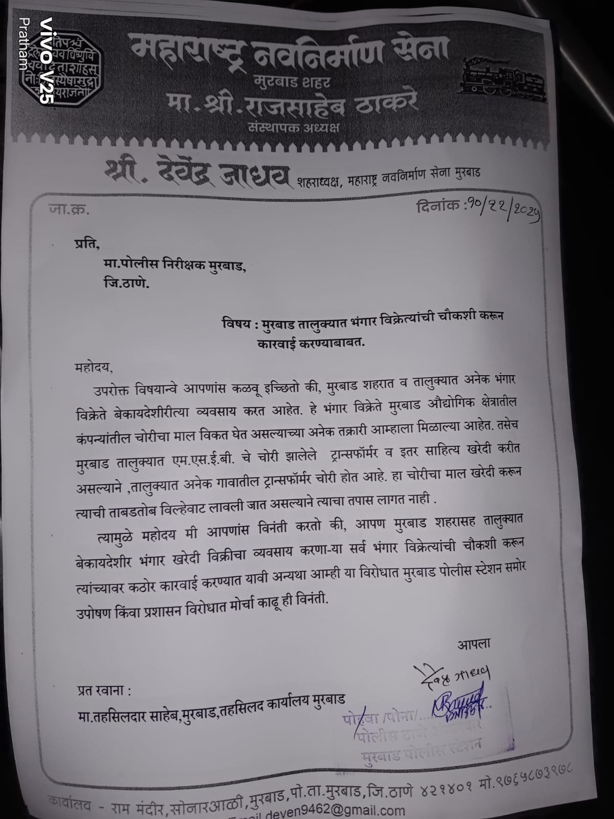 рдореБрд░рдмрд╛рдб (рдард╛рдгреЗ): рдореБрд░рдмрд╛рдб рд╢рд╣рд░рд╛рд╕рд╣ рддрд╛рд▓реБрдХреНрдпрд╛рдд рдмреЗрдХрд╛рдпрджреЗрд╢реАрд░рд░рд┐рддреНрдпрд╛ рднрдВрдЧрд╛рд░ рдЦрд░реЗрджреА-рд╡рд┐рдХреНрд░реАрдЪрд╛ рд╡реНрдпрд╡рд╕рд╛рдп рдХрд░рдгрд╛рд▒реНрдпрд╛рдВрд╡рд░ рдХрдареЛрд░ рдХрд╛рд░рд╡рд╛рдИ рдХрд░рд╛рд╡реА, рдЕрд╢реА рдорд╛рдЧрдгреА рдорд╣рд╛рд░рд╛рд╖реНрдЯреНрд░ рдирд╡рдирд┐рд░реНрдорд╛рдг рд╕реЗрдиреЗрдЪреЗ (рдордирд╕реЗ) рд╢рд╣рд░ рдЕрдзреНрдпрдХреНрд╖ рджреЗрд╡реЗрдВрджреНрд░ рдЬрд╛рдзрд╡ рдпрд╛рдВрдиреА рдХреЗрд▓реА рдЖрд╣реЗ. рднрдВрдЧрд╛рд░ рд╡рд┐рдХреНрд░реЗрддреЗ рдФрджреНрдпреЛрдЧрд┐рдХ рдХреНрд╖реЗрддреНрд░рд╛рддреАрд▓ рдХрдВрдкрдиреНрдпрд╛рдВрдордзреВрди рддрд╕реЗрдЪ рдорд╣рд╛рд╡рд┐рддрд░рдгрдЪреЗ (MSEDCL) рдЪреЛрд░реА рдЭрд╛рд▓реЗрд▓реЗ рдЯреНрд░рд╛рдиреНрд╕рдлреЙрд░реНрдорд░ рдЖрдгрд┐ рд╕рд╛рд╣рд┐рддреНрдп рдЦрд░реЗрджреА рдХрд░рдд рдЕрд╕рд▓реНрдпрд╛рдЪрд╛ рдЧрдВрднреАрд░ рдЖрд░реЛрдк рддреНрдпрд╛рдВрдиреА рдХреЗрд▓рд╛ рдЕрд╕реВрди, рдпрд╛рдмрд╛рдмрдд рддреНрдпрд╛рдВрдиреА рдереЗрдЯ рдореБрд░рдмрд╛рдб рдкреЛрд▓реАрд╕ рдирд┐рд░реАрдХреНрд╖рдХрд╛рдВрдирд╛ рдкрддреНрд░ рджрд┐рд▓реЗ рдЖрд╣реЗ.рдЧрдВрднреАрд░ рд╕реНрд╡рд░реВрдкрд╛рдЪреЗ рдЖрд░реЛрдк:рдордирд╕реЗ рд╢рд╣рд░ рдЕрдзреНрдпрдХреНрд╖ рджреЗрд╡реЗрдВрджреНрд░ рдЬрд╛рдзрд╡ рдпрд╛рдВрдиреА рдореБрд░рдмрд╛рдб рдкреЛрд▓реАрд╕ рдард╛рдгреНрдпрд╛рдЪреЗ рдкреЛрд▓реАрд╕ рдирд┐рд░реАрдХреНрд╖рдХ рдпрд╛рдВрдирд╛ рджрд┐рд▓реЗрд▓реНрдпрд╛ рдирд┐рд╡реЗрджрдирд╛рдд рдореНрд╣рдЯрд▓реЗ рдЖрд╣реЗ рдХреА, рдЕрдиреЗрдХ рднрдВрдЧрд╛рд░ рд╡рд┐рдХреНрд░реЗрддреЗ рд╣реЗ рдмреЗрдХрд╛рдпрджреЗрд╢реАрд░ рд╡реНрдпрд╡рд╕рд╛рдп рдХрд░рдд рдЖрд╣реЗрдд.тАв рдФрджреНрдпреЛрдЧрд┐рдХ рдЪреЛрд░реА: рдореБрд░рдмрд╛рдб рдФрджреНрдпреЛрдЧрд┐рдХ рдХреНрд╖реЗрддреНрд░рд╛рддреАрд▓ рдХрдВрдкрдиреНрдпрд╛рдВрдордзреВрди рдЪреЛрд░реАрд▓рд╛ рдЧреЗрд▓реЗрд▓рд╛ рдорд╛рд▓ рд╣реЗ рд╡рд┐рдХреНрд░реЗрддреЗ рд╡рд┐рдХрдд рдШреЗрдд рдЕрд╕рд▓реНрдпрд╛рдЪреНрдпрд╛ рдЕрдиреЗрдХ рддрдХреНрд░рд╛рд░реА рдордирд╕реЗрдХрдбреЗ рдЖрд▓реНрдпрд╛ рдЖрд╣реЗрдд.тАв рдЯреНрд░рд╛рдиреНрд╕рдлреЙрд░реНрдорд░ рдЪреЛрд░реА: рдпрд╛ рд╡рд┐рдХреНрд░реЗрддреНрдпрд╛рдВрдореБрд│реЗ рддрд╛рд▓реБрдХреНрдпрд╛рдд рдорд╣рд╛рд╡рд┐рддрд░рдгрдЪреНрдпрд╛ рдЯреНрд░рд╛рдиреНрд╕рдлреЙрд░реНрдорд░ рдЪреЛрд░реАрдЪреНрдпрд╛ рдШрдЯрдирд╛ рд╡рд╛рдврд▓реНрдпрд╛ рдЖрд╣реЗрдд. рдЪреЛрд░реА рдЭрд╛рд▓реЗрд▓реЗ рдЯреНрд░рд╛рдиреНрд╕рдлреЙрд░реНрдорд░ рдЖрдгрд┐ рдЗрддрд░ рд╕рд╛рд╣рд┐рддреНрдп рд╣реЗ рднрдВрдЧрд╛рд░ рд╡рд┐рдХреНрд░реЗрддреЗ рдЦрд░реЗрджреА рдХрд░рддрд╛рдд.тАв рдкреБрд░рд╛рд╡реНрдпрд╛рдВрдЪреА рд╡рд┐рд▓реНрд╣реЗрд╡рд╛рдЯ: рдЪреЛрд░реАрдЪрд╛ рдорд╛рд▓ рдЦрд░реЗрджреА рд╣реЛрддрд╛рдЪ рддреНрдпрд╛рдЪреА рддрддреНрдХрд╛рд│ рд╡рд┐рд▓реНрд╣реЗрд╡рд╛рдЯ рд▓рд╛рд╡рд▓реА рдЬрд╛рдд рдЕрд╕рд▓реНрдпрд╛рдиреЗ, рдЪреЛрд░реАрдЪреНрдпрд╛ рдкреНрд░рдХрд░рдгрд╛рдВрдЪрд╛ рддрдкрд╛рд╕ рд▓рд╛рдЧрдд рдирд╕рд▓реНрдпрд╛рдЪреЗрд╣реА рддреНрдпрд╛рдВрдиреА рдирд┐рджрд░реНрд╢рдирд╛рд╕ рдЖрдгреВрди рджрд┐рд▓реЗ рдЖ