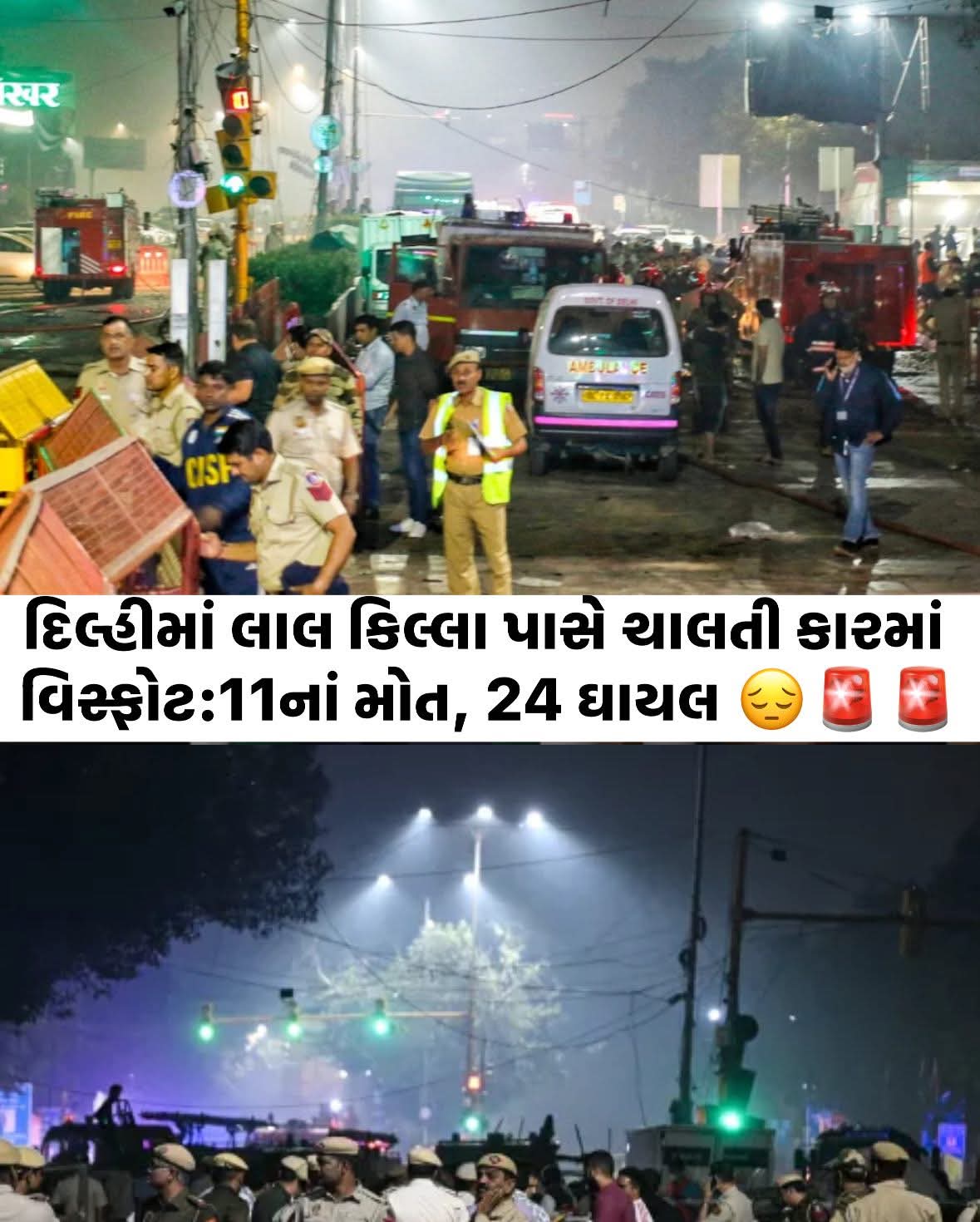 દિલ્હી મા લાલ કિલ્લા પાસે ચાલતી કારમાં વિસ્ફોટ:11 ના મોત, 24 ધાયલ🚨😞🚨
