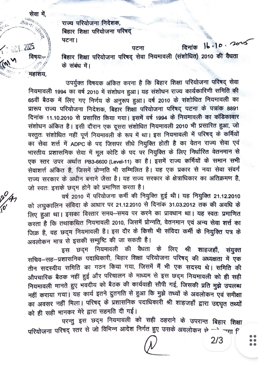 आरोप है कि फर्जी 2010 नियमावली के अनुसार, बीईपीसी के एक पदाधिकार ADPC का वेतनमान लेवल-11 (6600 GP) तय किया गया, जबकि BPSC से चयनित अधिकारियों का अधिकतम एंट्री पे लेवल-9 और UPSC/केंद्र सेवा अधिकारियों का लेवल-10 है।