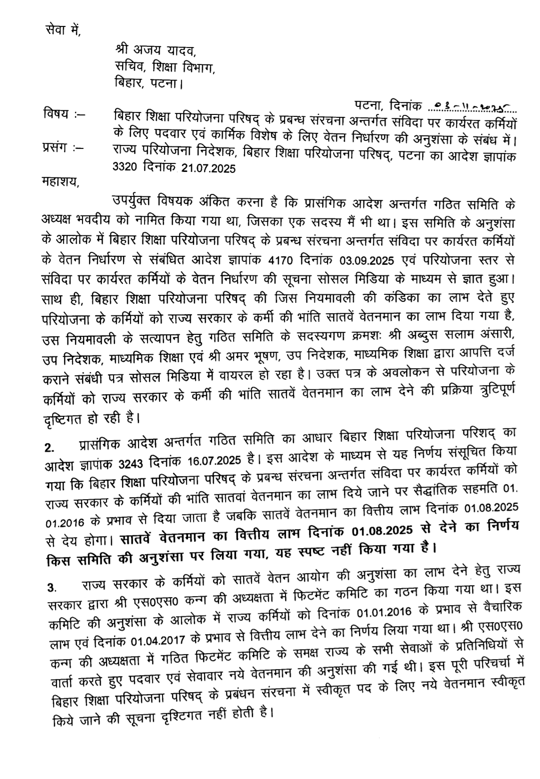 बिहार शिक्षा परियोजना परिषद (BEPC) में संविदा (Contractual) पर कार्यरत कर्मियों को राज्य कर्मियों के समान सातवें वेतनमान का लाभ देने को लेकर गंभीर अनियमितताओं का मामला सामने आया है। इस संबंध में विभागीय पत्रों एवं अभिलेखों से यह स्पष्ट हो गया है कि बिना राज्य सरकार या वित्त विभाग की अनुमति के, परिषद स्तर पर ही गुपचुप तरीके से नियमों का उल्लंघन करते हुए यह लाभ दिया गया।