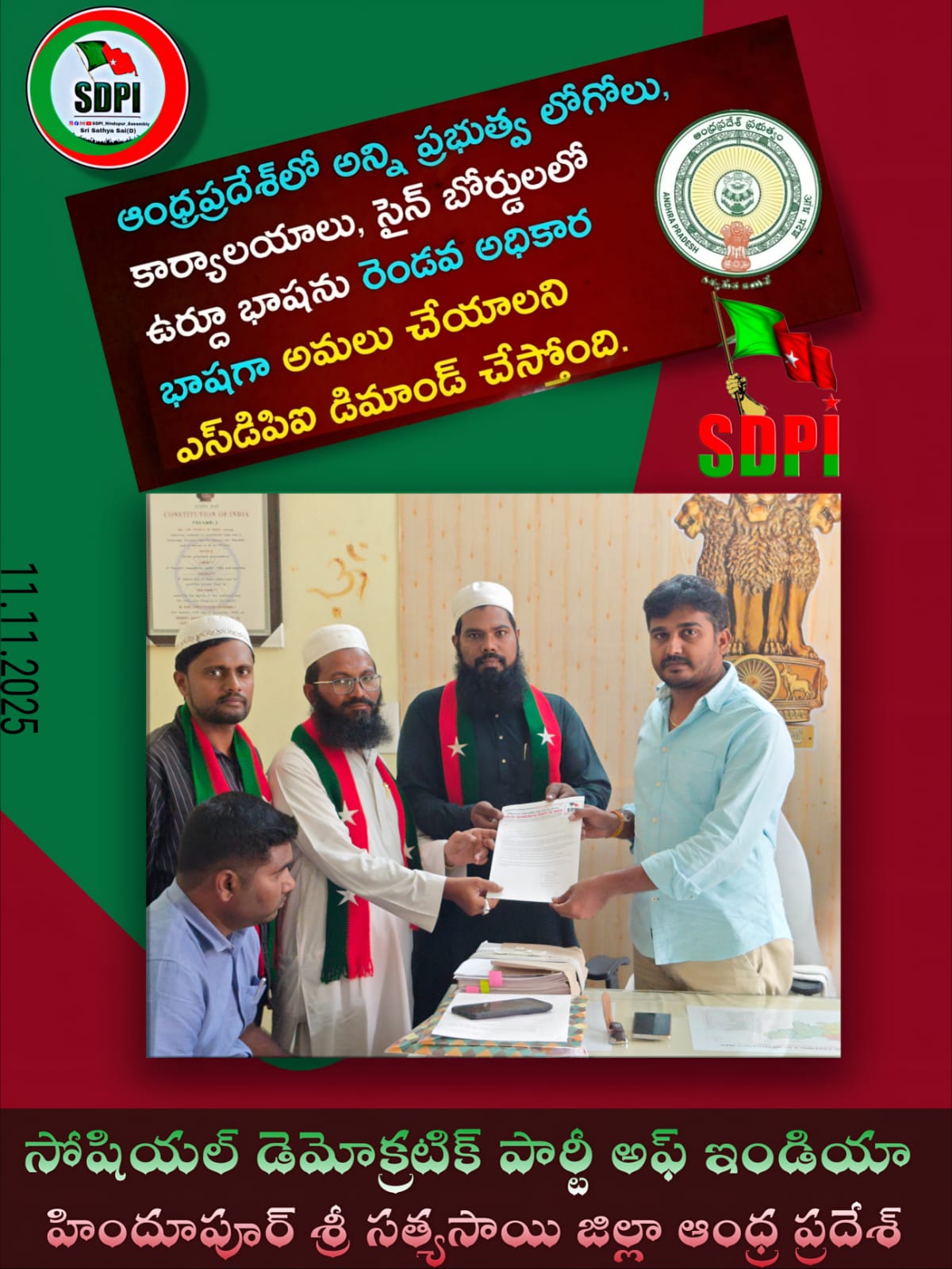 ఆంధ్ర ప్రదేశ్ రెండవ అధికార భాషగా ఉన్న ఉర్దూ భాషను ప్రభుత్వ కార్యాలయాల్లో అమలు చేయాలని సోషల్ డెమోక్రటిక్ పార్టీ ఆఫ్ ఇండియా (SDPI) హిందూపురం అసెంబ్లీ నాయకులు మరియు జిల్లా నాయకులు MRO గారికి వినతిపత్రం అందజేశారు.