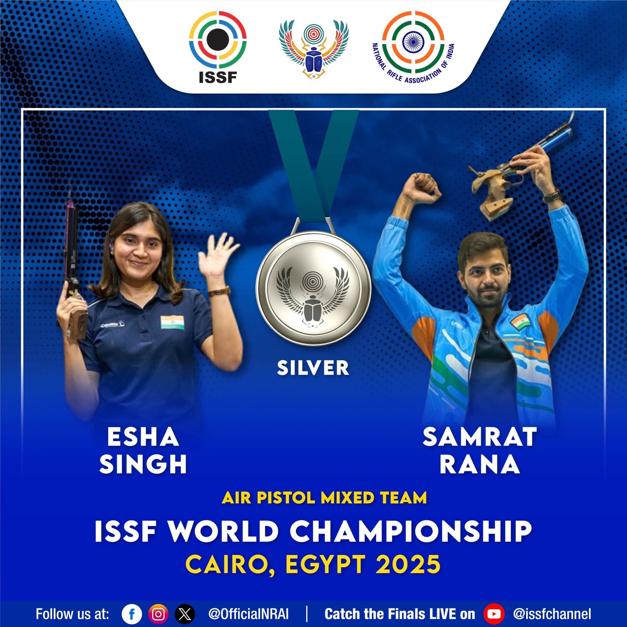🇮🇳 Esha & Samrat win 🥈in 10m air pistol mixed team event at ISSF World Championships in Cairo
