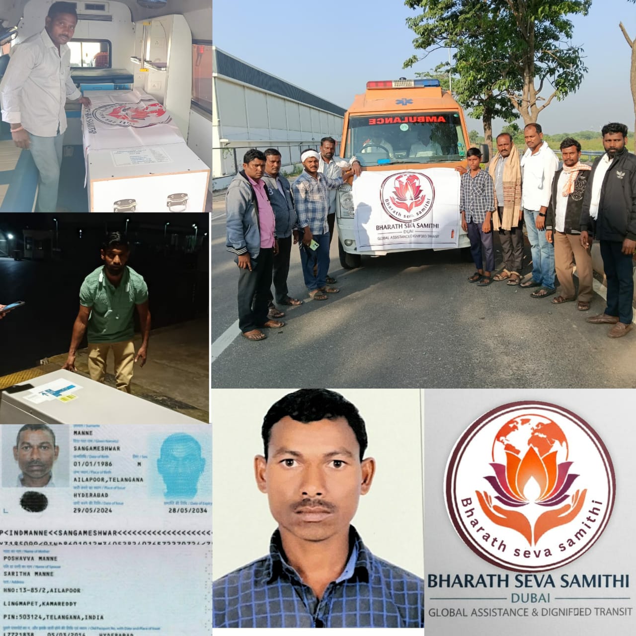 షార్జా యూఏఈ: కామారెడ్డి (జిల్లా) అయిలాపూర్ గ్రామం, లింగంపెట్: వివరాల్లోకి వెళితే గ్రామానికి చెందిన మన్నె సంగమేశ్వరు (39) గల్ఫ్ ఉపాధి నిమిత్తం షార్జా లో ఏడది నర కిందట వచ్చి కార్మికునిగా పనిచేస్తున్న సంగమేశ్వర్ కు (భార్య) ఇద్దరు కుమారులు, కుటుంబ ఆర్థిక స్థోమత చినంత.. పని చేసే చోట ఆత్మహత్య చేసుకున్నాడు. 10-10-2025 రోజున ఈ సమాచారాన్ని వాళ్ళ కుటుంబసభ్యులుకు తెలిపారు. అతని మిత్రులు మన్నె సాయిలు.. "భారత్ సేవా సమితి దుబాయ్" బొమ్మ ప్రవీణ్ ను సంప్రదించగా కంపెనీ తో మాట్లాడి ఇంటి దగ్గర నుంచి అధికార ద్రువీకరణ పత్రాలు తెప్పించి, ఈ రోజు షార్జా నుండి హైదరాబాద్ 11.11.2025 నాడు మన్నె సంగమేశ్వర్ మృతదేహన్ని వారి స్వగ్రామంకు బయలుదేరుతుంది .. కంపెనీ వారి సహాయం మరియు "భారత్ సేవా సమితి సభ్యులు మృతదేహాన్ని తరలించేందుకు సహాయం చేశారు. కంచర్ల శ్రీనివాస్ రెడ్డి ప్రత్యేక చొరవతో హైదరాబాద్ నుంచి అయిలాపూర్ కు అంబులెన్స్ ని ఏర్పాటు చేశారు.