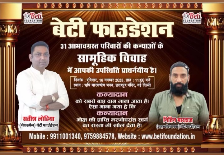 बेटी फाउंडेशन 16 नवंबर को 31 अभावग्रस्त परिवारो की कन्याओं का सामुहिक विवाह सम्मेलन आयोजित किया रहा है।