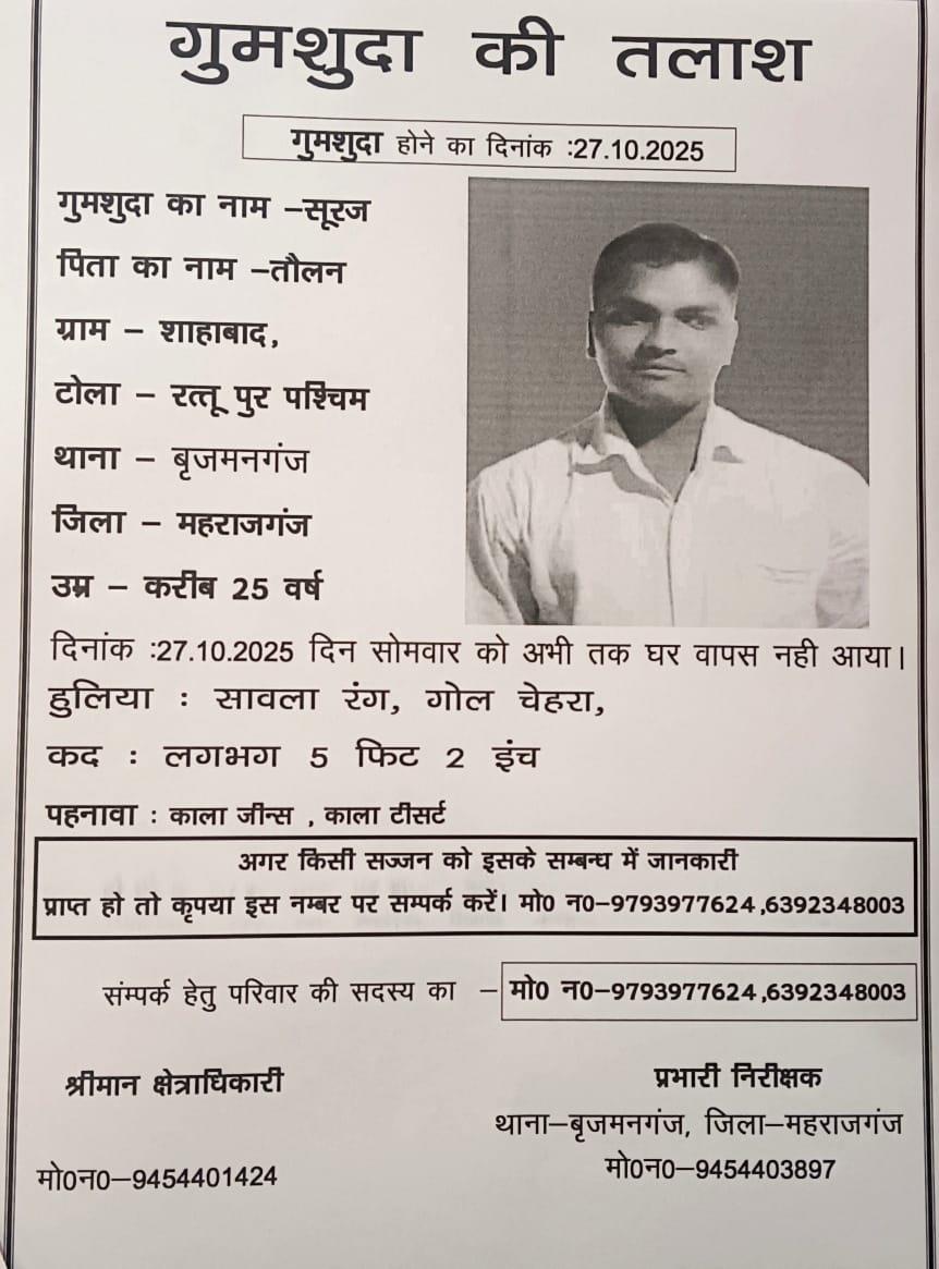 बृजमनगंज, महाराजगंज: थाना बृजमनगंज पुलिस ने एक लापता युवक की तलाश में अपील की है। सूरज पुत्र तौलन, निवासी शाहाबाद रत्तुपुर, थाना बृजमनगंज, जनपद महाराजगंज, उम्र करीब 25 वर्ष, दिनांक 27/10/2025 से लापता है।