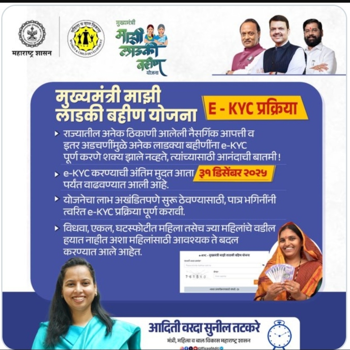 राजुरा चंद्रपूर: राज्यातील लाडक्या बहि‍णींसाठी मोठी खूशखबर हाती आली आहे. लाडकी बहीण योजनेची E-KYC करणाऱ्या महिलांना राज्य सरकारने मोठा दिलासा दिला आहे. सरकारने e-KYC साठी मुदतवाढ ही ३१ डिसेंबरपर्यंत मुदतवाढ दिली आहे. त्यामुळे e-KYC करणे बाकी असलेल्या लाडक्या बहि‍णींना पुरेसा अवधी मिळणार आहे. मंत्री आदिती तटकरे यांनी सोशल मीडियावर पोस्ट करत माहिती दिली. मुख्यमंत्री देवेंद्रजी फडणवीस, उपमुख्यमंत्री एकनाथ शिंदे, उपमुख्यमंत्री अजित पवार यांच्या नेतृत्वात मुख्यमंत्री माझी लाडकी बहीण योजना संपूर्ण राज्यात अतिशय यशस्वीरित्या राबवली जात आहे. याबाबत दिनांक १८ नोव्हेंबर २०२५ पूर्वी सर्व लाभार्थ्यांनी e-KYC प्रक्रिया करावी अशा सूचना यापूर्वी देण्यात आल्या होत्या. परंतु, गेल्या काही दिवसांत आपल्या राज्यात आलेल्या नैसर्गिक आपत्ती आणि इतर अडचणींमुळे, 'मुख्यमंत्री माझी लाडकी बहीण' योजनेतील अनेक पात्र भगिनींना e-KYC प्रक्रिया वेळेत पूर्ण करता आली नाही, याची मला पूर्ण कल्पना आहे. या अडचणींची गांभीर्याने नोंद घेत राज्य सरकारने एक अत्यंत महत्त्वपूर्ण निर्णय घेतला आहे.