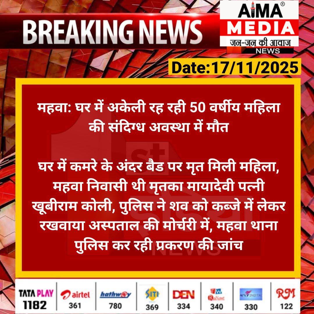 घर में कमरे के अंदर बैड पर मृत मिली महिला, महवा निवासी थी मृतका मायादेवी 50 पत्नी खूबीराम कोली, पुलिस ने शव को कब्जे में लेकर रखवाया अस्पताल की मोर्चरी में...