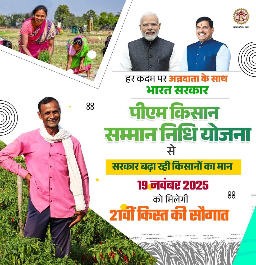 "पीएम किसान सम्मान निधि" योजना के तहत 𝟏𝟗 नवंबर 𝟐𝟎𝟐𝟓 को किसानों को मिलेगी 𝟐𝟏वीं किस्त की सौगात।
