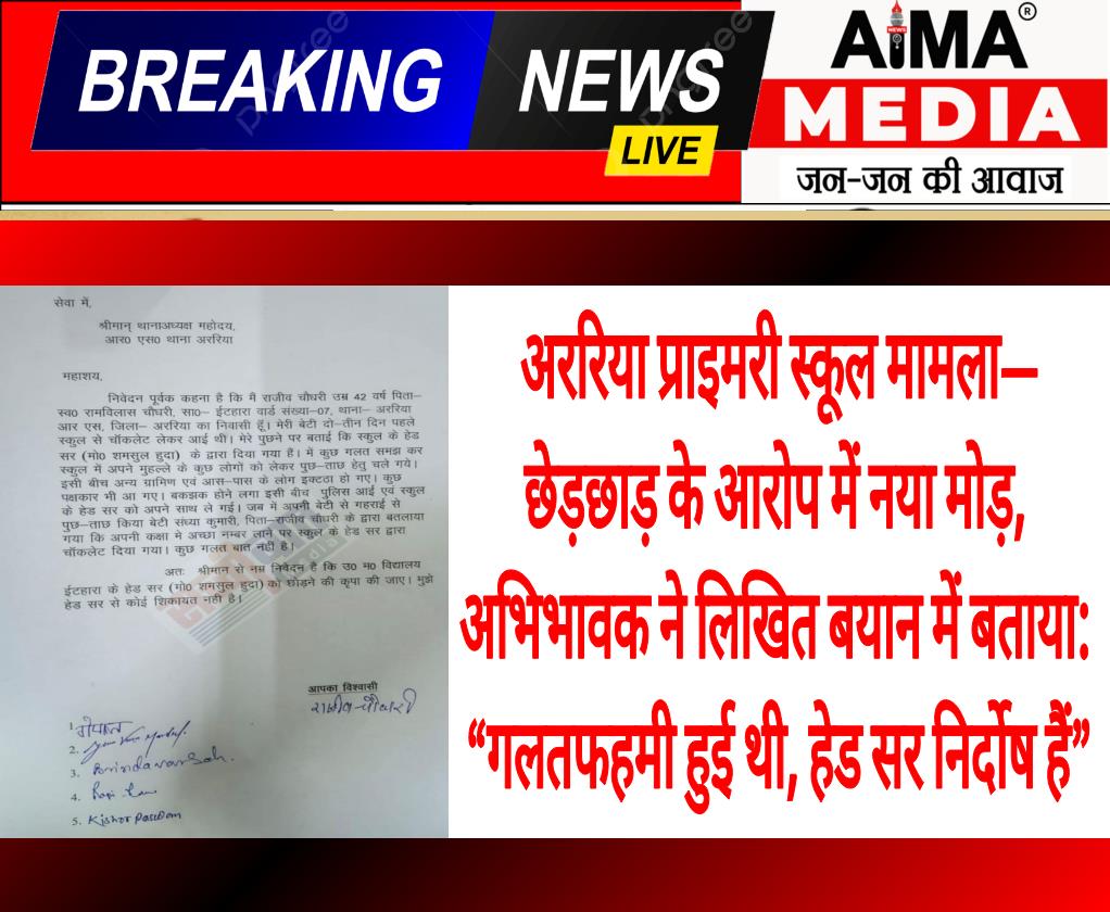 अररिया प्राइमरी स्कूल मामला—छेड़छाड़ के आरोप में नया मोड़, अभिभावक ने लिखित बयान में बताया: “गलतफहमी हुई थी, हेड सर निर्दोष हैं”