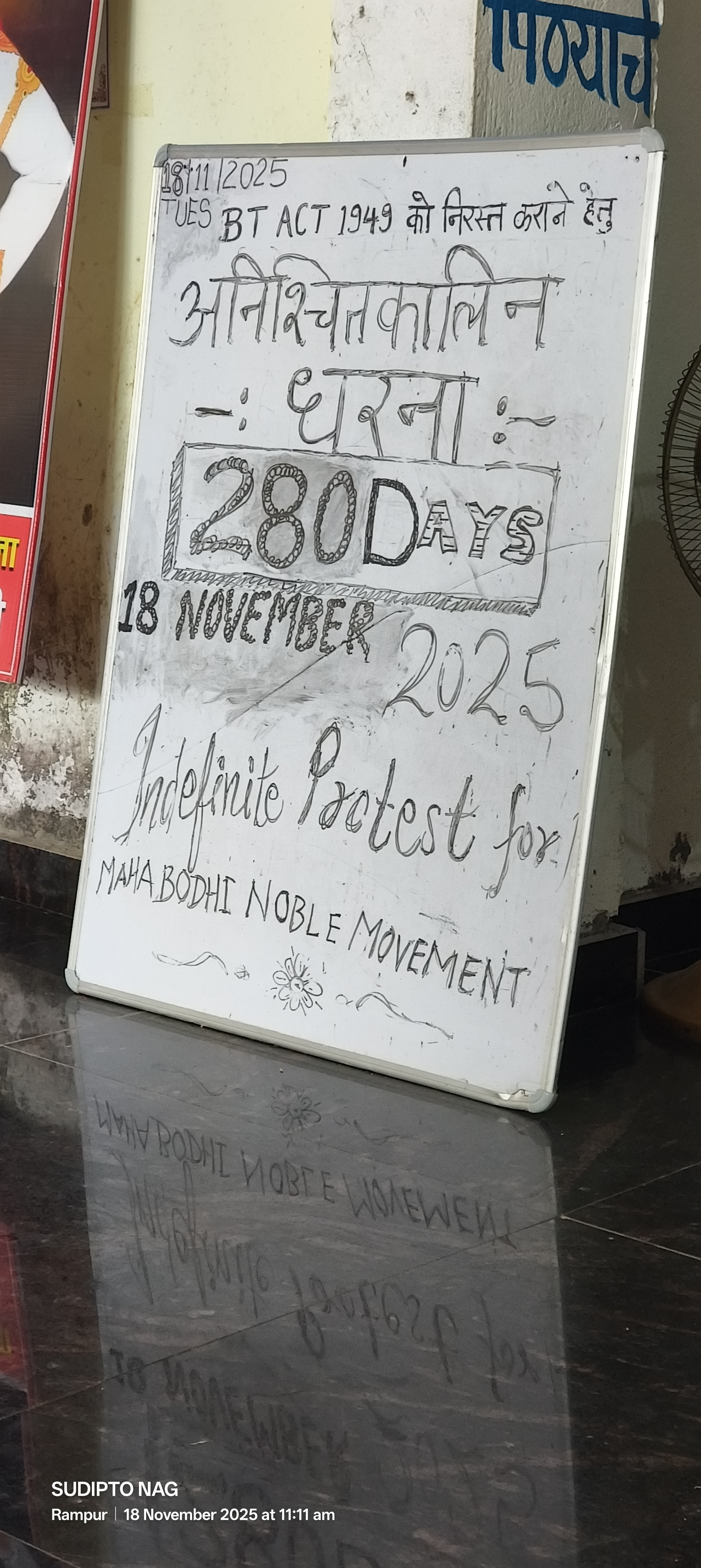 महाबोधि महाविहार के पूर्ण प्रबंधन अधिकार बौद्ध समुदाय को सौंपने तथा बोधगया मंदिर अधिनियम 1949 को निरस्त करने की मांग को लेकर चल रहा आंदोलन एक बार फिर निर्णायक चरण में प्रवेश करने जा रहा है। ऑल इंडिया बुद्धिस्ट फोरम एवं ऑल बुद्धिस्ट ऑर्गनाइजेशन की ओर से आकाश लामा ने घोषणा की है कि बोधगया के रामपुर रोड के महुआबाद स्थित डॉ. आम्बेडकर बुद्ध विहार में 20 नवम्बर 2025 से अनिश्चितकालीन शांतिपूर्ण धरना पुनः प्रारम्भ किया जाएगा।
