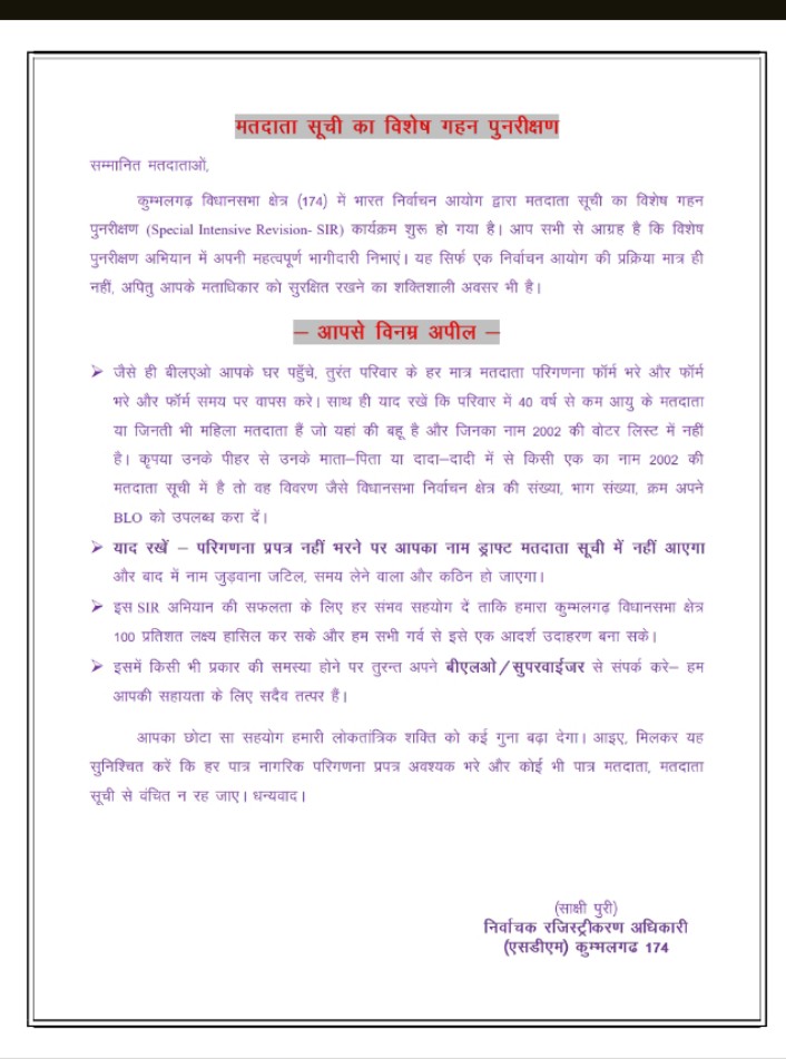 भारत निर्वाचन आयोग द्वारा कुम्भलगढ़ विधानसभा क्षेत्र (174) में मतदाता सूची का विशेष गहन पुनरीक्षण (Special Intensive Revision–SIR) कार्यक्रम शुरू किया गया है। आप सभी से विनम्र आग्रह है कि इस महत्त्वपूर्ण अभियान में अपनी सक्रिय भागीदारी सुनिश्चित करें। यह केवल एक प्रक्रिया नहीं, बल्कि आपके मताधिकार को सुरक्षित रखने का अवसर है।