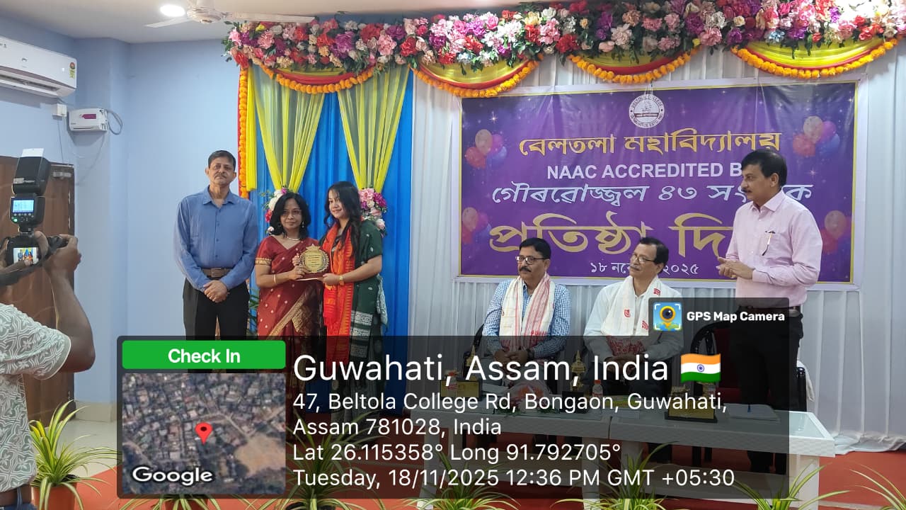 बेल्टोला कॉलेज ने 18 नवंबर, 2025 को अपना शानदार "43वां स्थापना दिवस" मनाया। कार्यक्रम की शुरुआत सुबह 8:45 बजे कॉलेज के प्रिंसिपल डॉ. अजीत बोरकोटोकी द्वारा कॉलेज ध्वज फहराने के साथ हुई। कार्यक्रम में सभी शिक्षण और गैर-शिक्षण कर्मचारी और छात्र शामिल हुए। शहीदों को शिक्षा विभाग की सहायक प्रोफेसर जश्मीन बहार और फिर सभी उपस्थित लोगों ने श्रद्धांजलि अर्पित की। होंडा सेफ्टी ड्राइविंग एजुकेशन सेंटर और डीटीओ, कामरूप मेट्रो, असम के सहयोग से कॉलेज के सहायक प्रोफेसर कमरुज जमान और रमेश कुमार राय के नेतृत्व में बेलटोला क्षेत्र में एक यातायात जागरूकता कार्यक्रम का आयोजन किया गया।