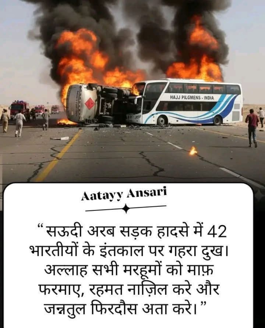 40 Haji logo ka hua intakal Makka se madina jate wakt bus petrol ke truck se takra gai aur blast hote h aag me 40 logo ke hue maut
