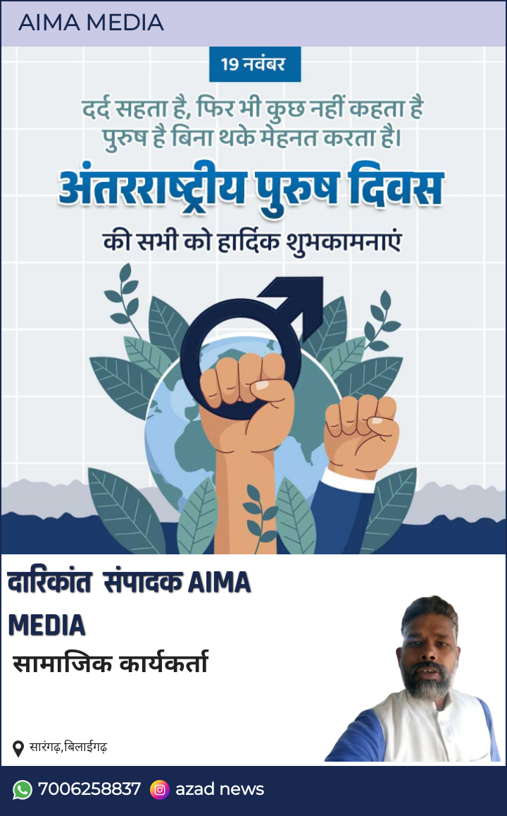 सारंगढ़। आज विश्वभर में अंतरराष्ट्रीय पुरुष दिवस बड़े सम्मान और भावनात्मक महत्व के साथ मनाया जा रहा है। इस अवसर पर आइमा मीडिया के संपादक दारिकांत ने समस्त पुरुषों को हार्दिक शुभकामनाएं देते हुए कहा कि यह दिवस समाज में पुरुषों की भूमिका, उनके योगदान, त्याग और संघर्ष को सम्मानपूर्वक याद करने का अवसर है।
