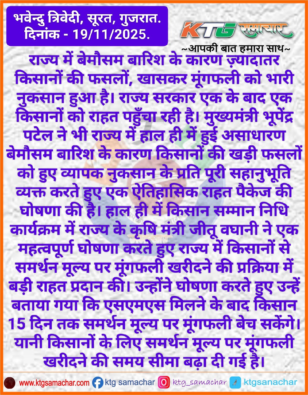 राज्य के कृषि मंत्री जीतू वाघनी ने एक महत्वपूर्ण घोषणा करते हुए राज्य में किसानों से समर्थन मूल्य पर मुंगफली खरीदने की प्रक्रिया में बड़ी राहत प्रदान की।