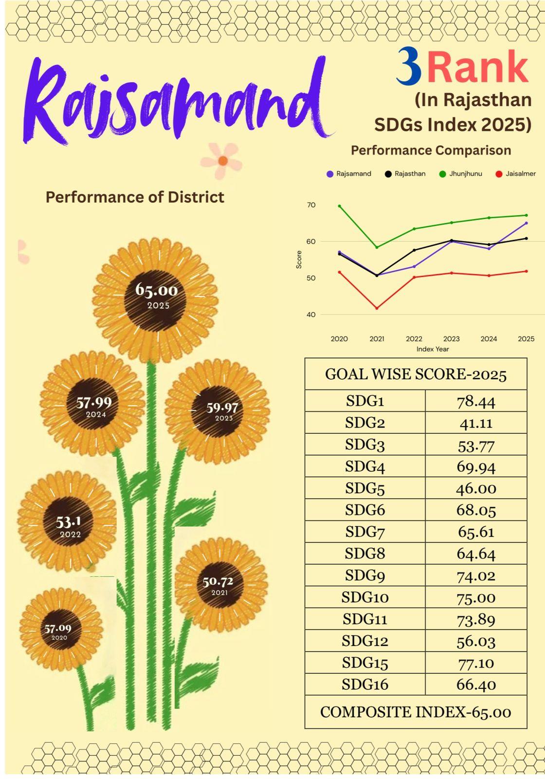 राजसमंद। आर्थिक एवं सांख्यिकी निदेशालय द्वारा जारी राजस्थान एसडीजी (सतत् विकास लक्ष्य) इंडेक्स रिपोर्ट-2025 में राजसमंद जिले ने उल्लेखनीय उपलब्धि दर्ज करते हुए प्रदेश में तीसरा स्थान प्राप्त किया है। यह रिपोर्ट 14 सतत् विकास लक्ष्यों और 100 इंडिकेटर्स पर आधारित है। रिपोर्ट के अनुसार झुंझुनू जिला 67.13 स्कोर के साथ प्रथम, चित्तौड़गढ़ 65.41 स्कोर के साथ द्वितीय तथा राजसमंद 65.00 स्कोर के साथ तृतीय स्थान पर रहा।