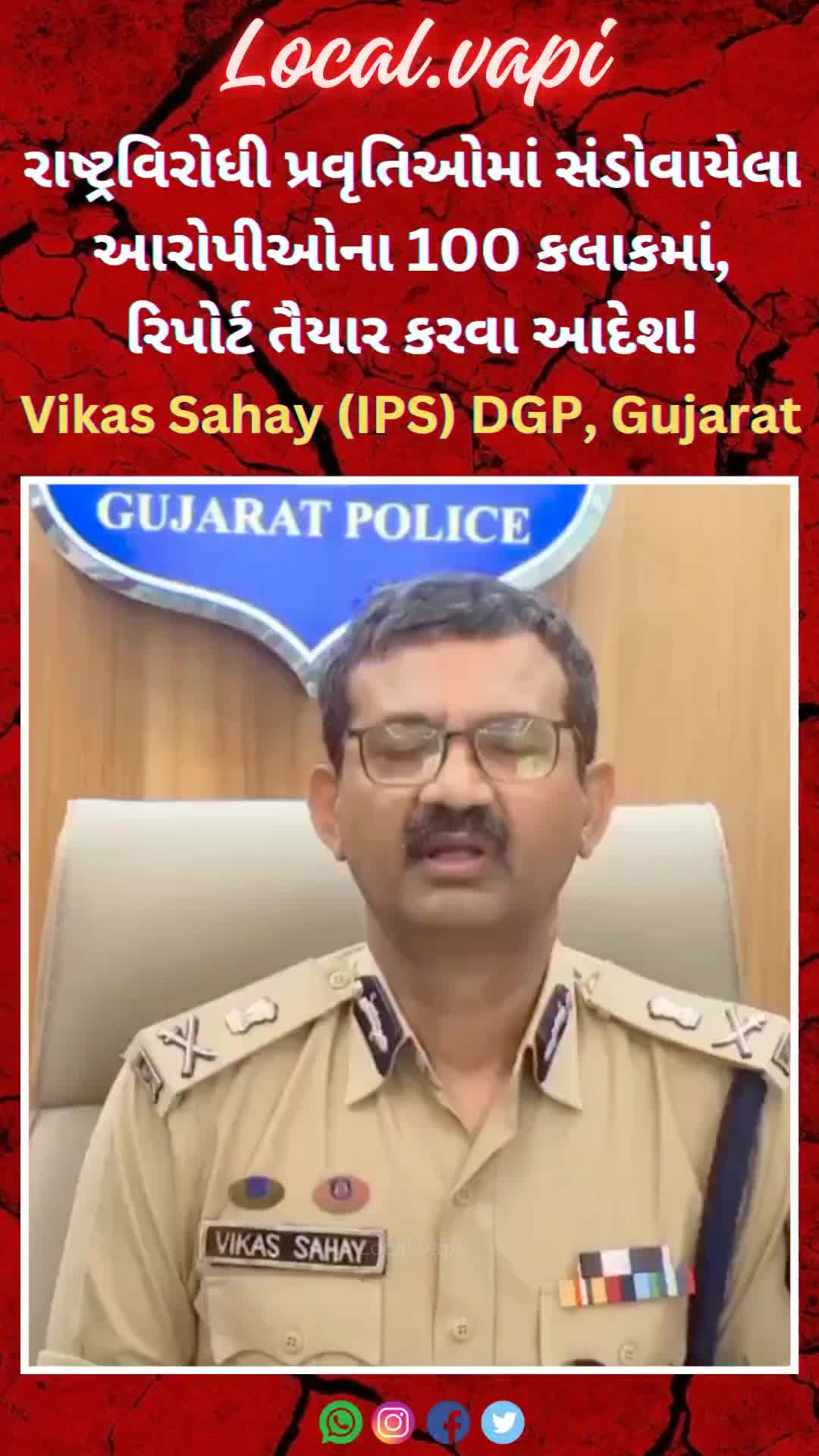 રાષ્ટ્રવિરોધી પ્રવૃતિઓમાં સંડોવાયેલા આરોપીઓના 100 કલાકમાં, રિપોર્ટ તૈયાર કરવા આદેશ! Vikas Sahay (IPS) DGP, Gujarat