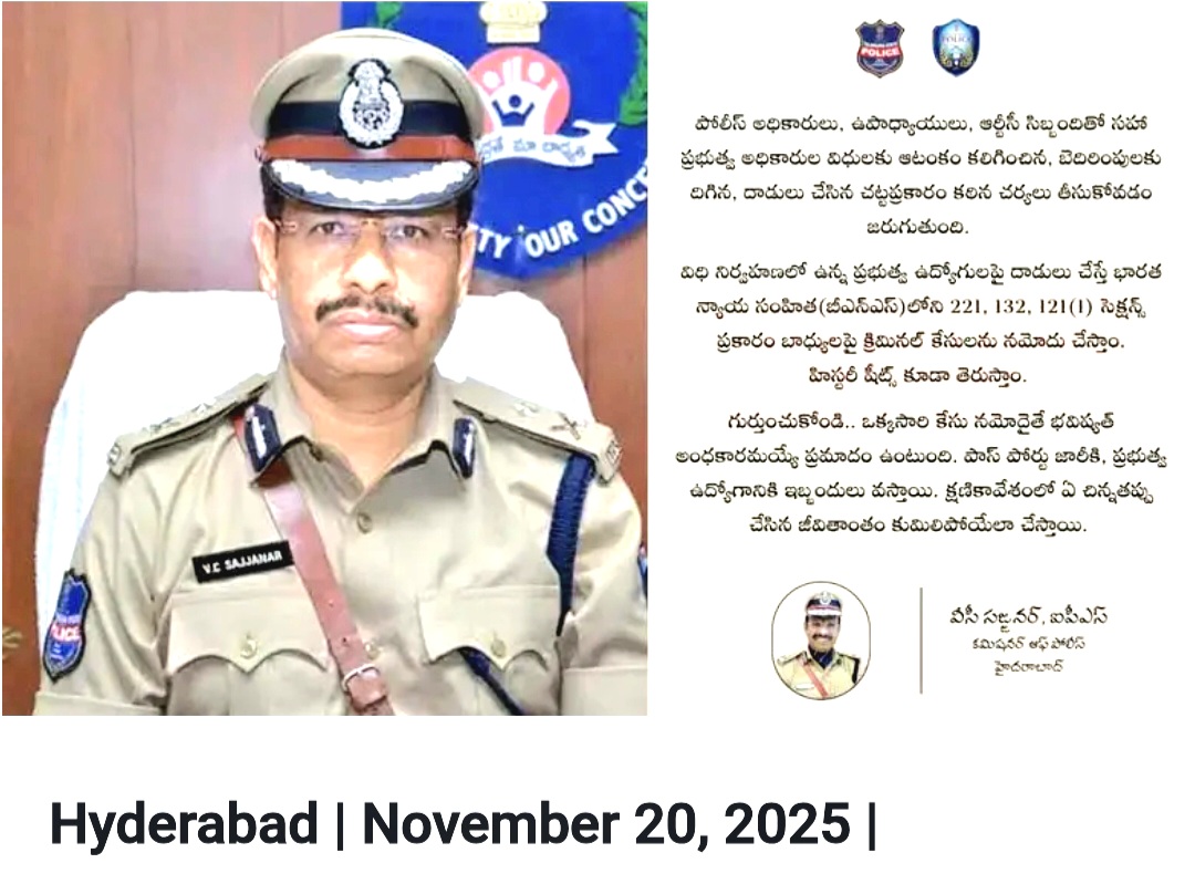 Hyderabad City Police Commissioner V.C. Sajjanar has issued a strong warning that strict legal action will be taken against anyone who attacks or obstructs government employees while they are performing their duties.