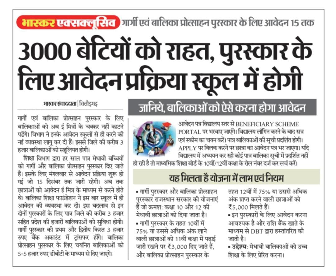 *गार्गी– बालिका प्रोत्साहन पुरस्कार योजना 2025-26 के आवेदन 19 नवंबर से 15 दिसंबर तक भरवाए जाएंगे।*